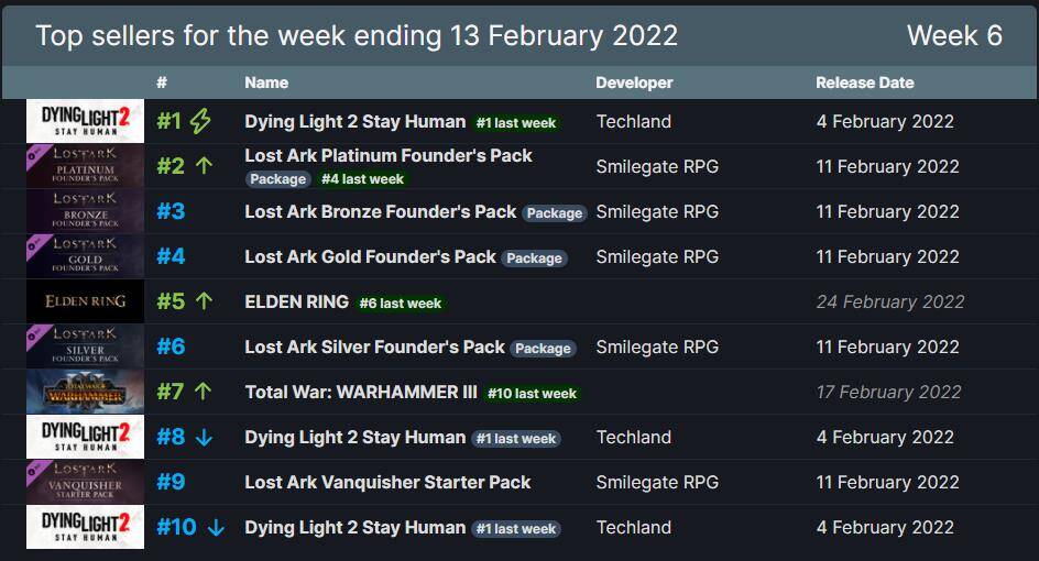 Steam公开新一周销量榜(2月7日至2月13日),《消逝的光芒2》二连冠,2-4名被《失落的方舟》Founder包所占据,第五名为《艾尔登法环》。