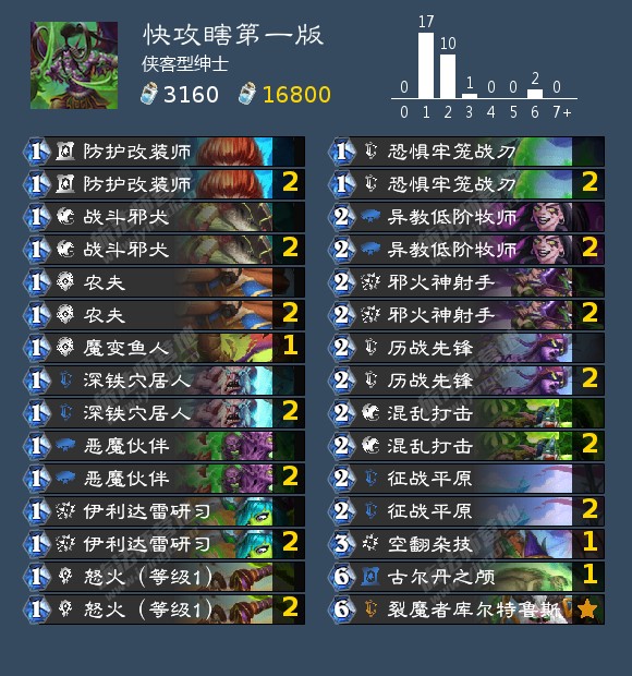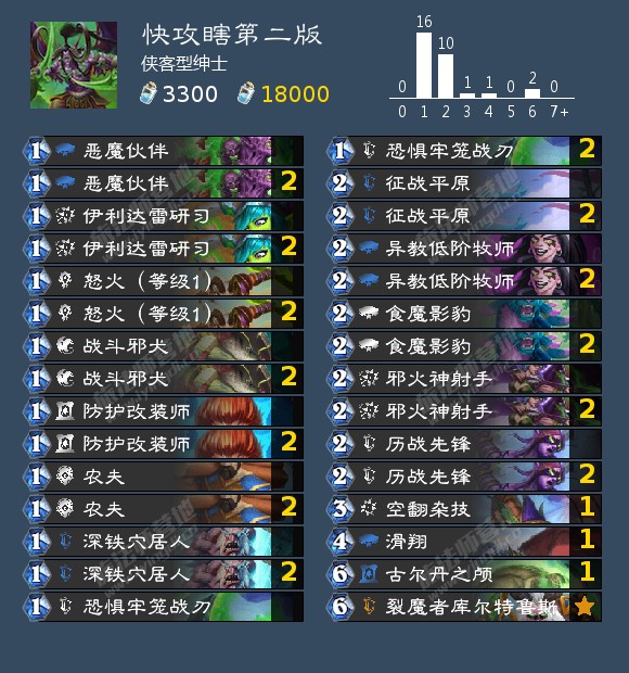 原作者抛弃了现版本主流邪能瞎带的otk组件演员大接力,保留了邪能的部分,即邪能弹幕怒火(等级1)混乱打击的打脸三件套,以及能配合的邪能吞食者和杰斯·织暗,在此基础上加入了各种低费快攻卡。然而实际打起来以后很快就能发现一些问题:首先,杰斯的爆发点太晚且太弱,众所周知正常的邪能瞎杰斯的爆发除了上述提到的打脸三件套以外,还会有献祭光环,邪吼冲击,混乱吸取甚至眼棱等清场牌,利用杰斯优先选取对面为目标的特性进行返场。但是这套快攻瞎只带了三件套,他的价值几乎仅限于打脸,且在对面有场面的情况下弹幕是打不到脸的,那计算一下伤害,我们会发现他伤害范围大概只有10点(因为怒火通常都会在等级2时就打出去了,没时间等到10费),这样的伤害作为一个卡组的很重要的终结手段,我认为只是中规中矩,这还是算你全打过这些牌的情况,与其这样还不如带一张大接力,至少变身以后终结伤害比这个靠谱多了。其次,这套牌的过牌手段,有两张头,两个443和混乱打击,我实际去打的时候经常在5费左右手牌打空,然后绝望的等着抽一打一,这套与其说是快攻但是实际更偏向中速,中期节奏很容易断档。综合上述问题,我改出来了第一版(勿抄)