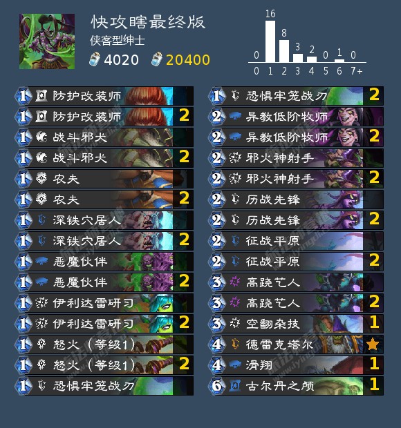 首先是空翻和头的比较,都是在6费左右打出的过牌,空翻更不容易卡到自己,而且比头多过一张,卡住无法触发的情况很少。而头的优点是几乎抽到的三张都可以立马打出去发挥价值,而且在前面用过研习的情况下有时可以提前打出,卡组低费牌很多,所以只要前期正常的倾卸手牌,也很少会卡流放。然后将混乱打击换成了更老的瞎子快攻常客,食魔影豹我一直以为这玩意叫影食魔豹来着,比起打2我觉得站个怪更有用一些。另外发现滑翔在这套里也很好用,高分段我碰到很多法强萨,超凡德,奇迹牧蓝龙牧,他们经常一手的牌,我这边4费手牌只剩一两张,这时候滑一下既能破坏他们的手牌节奏又能给自己过牌,不要太爽。不过渐渐地还是发现明显的缺点——碰到解牌多的职业如火冲法,带暗言术:噬的牧师还有任务萨,我们的场面他们不非常卡手的话很容易解干净,而我前期虽然蹭了血但是却掏不出直伤完成斩杀,无奈看着对面残血翻盘。影豹也没有想象中好用,比混乱打击强一点,但是放这套牌了还是价值太低。那么有什么卡是既可以打脸,又能站场,又能过牌的呢?我终于想起了一张牌——高跷艺人。实战下来完美契合我们的卡组思路,于是终于完成了最终版改良