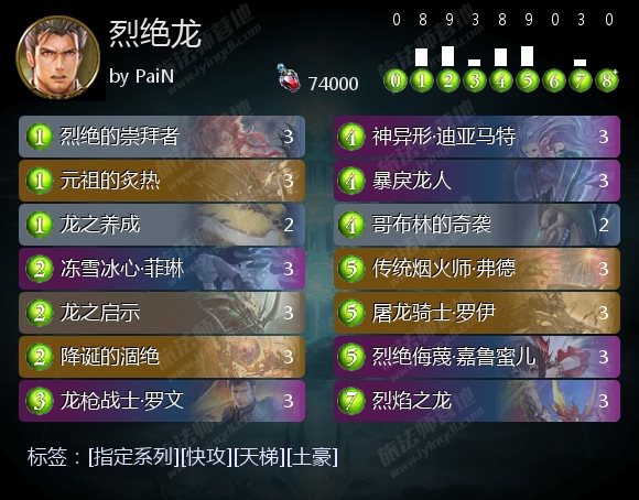 不过,放弃Buff和自然体系,也使烈绝龙比屁股龙、自然龙更容易卡手,而且过牌变得更加促襟见肘。为此,目前的烈绝龙普遍满编降诞的涸绝,利用它持续补充资源。如果想进一步提升稳定性,可以减少或放弃龙之养成、哥布林的奇袭,投入炽火的烈绝或荒天雷神。