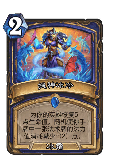 这张的设计很晚才改成这样(一两个月之前?),之前是“为你的英雄恢复6点生命值,使你手牌中法术牌的法力值消耗减少(1)点”。事实证明群体减费不是什么好主意对吧?别说我们不吸取教训。