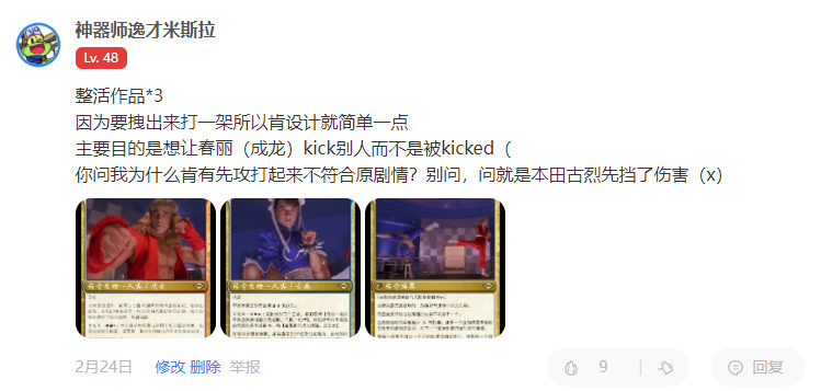 参与方式:在本文章评论区发表你的街霸角色(只要是来自《街头霸王》历代作品中的角色皆可)万智牌DIY设计,包含较为完整的牌张信息(比如:牌名、法术力费用\类别、规则文字、力量/防御等等)。你仅需发布文字信息即可参与活动,如果有条件的话,也同样欢迎大家发布图片版本的DIY作品。