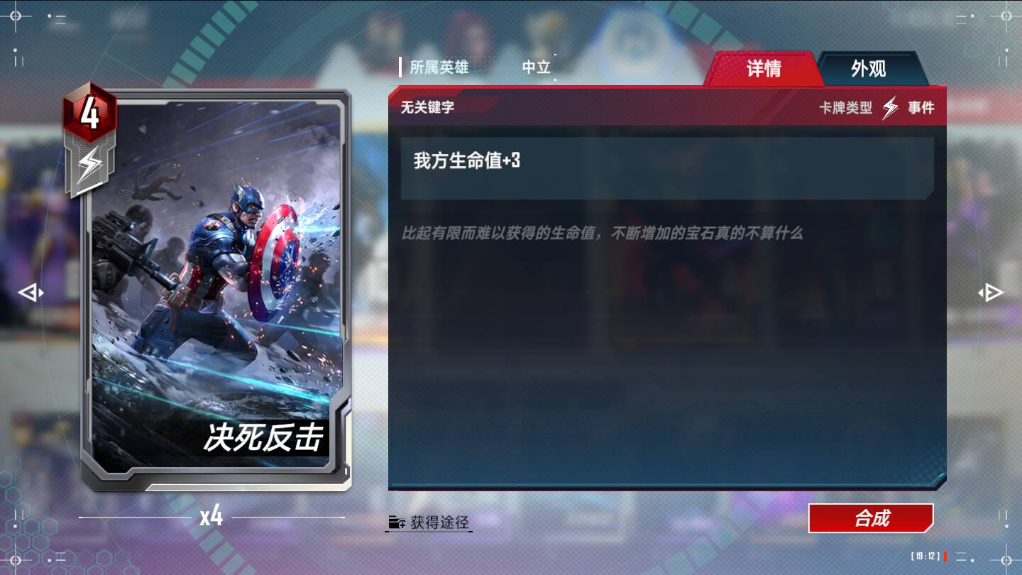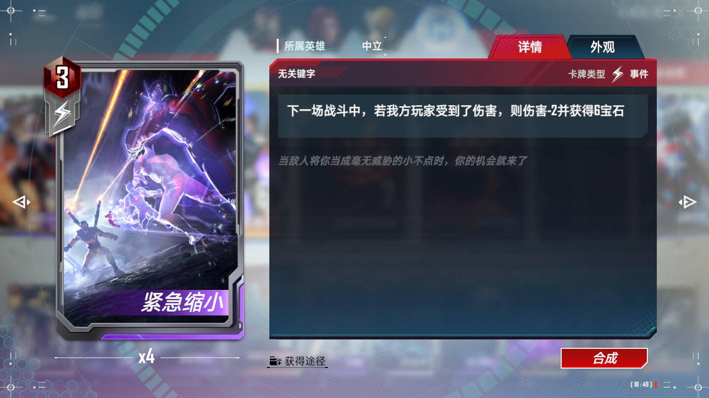 决死反击1张,本卡组前期很可能会大量掉血(后面会说原因),4点血的回复虽然不多,但是在我们血量只有个位数时,能防止苏特砍头,以及提供再一次配合缩小保命的可能。