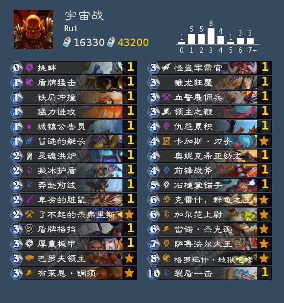 这套宇宙战同样利用高额爆发来取胜。一般为奔赴前线+铜须+雇佣兵+加尔范上尉/吼爹。配合雇佣兵的方法有很多,如艇长,挑衅,领主之鞭甚至是323给的跟班打2。组件都可以根据不同情况拆开使用,在面对质量不如自身的卡组时,奔赴前线可以当进化版的法力饼干使用。艇长,挑衅,领主之鞭,加尔范上尉和吼爹都可以拿去解场。不得不说这个迷你包的战士牌还是很优秀的,1费的打10和+2+1突袭都是被低估的牌。1费打10可以配合冲锋轻松过墙斩杀,前期也是低费的超级单解,并且可以配合前锋战斧过牌,宇宙战完全不怕卖血。 雏龙狂魔个人认为是苦痛的上位替代,面对铺场型快攻很容易过2张以上的牌,暴怒属性也可以被萨鲁法尔大王复活,避免群龟之王没上手只能复活一个的尴尬。+2+1突袭作用和挑衅一样,前期配合脏鼠拉+解,配合巴罗夫清场,配合激怒/暴怒,配合雏龙狂魔过牌,最重要的交易属性使整个卡组更加灵活。