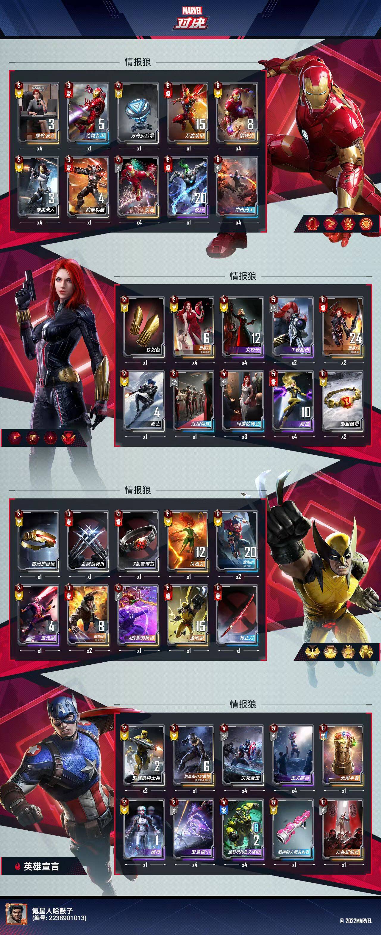 金刚狼(恶魔之举)带2/4 3狼,情报狼前期稳血的核心,最少也得2张才能玩,四张上限很高,但我只有2张,也可以比较稳定的上分,3回合拿到的时候,可以把场上不重要的卡牌卖掉,让他一个人单刷快速觉醒。养的不大,内战的时候可以给他用夜巡,跟对面掀桌子。