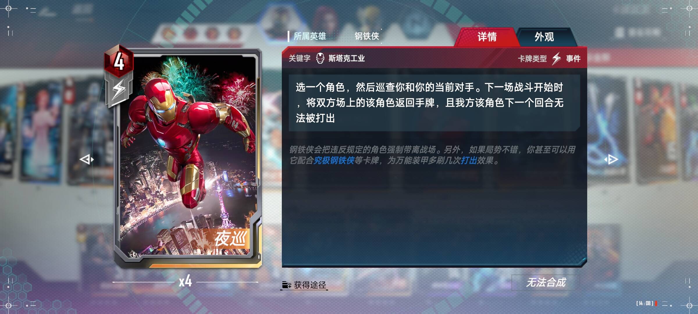 钢铁侠带3/4 其实带3张就够了,为什么我带4张呢?因为我想告诉你我卡全因为有时候可以碰4可碰带钢铁侠,有机会弄到4+1,4星钢铁侠可以对边上两个怪打40的穿甲伤害,很可能就直接干掉3个怪,梦想总是要有的嘛。