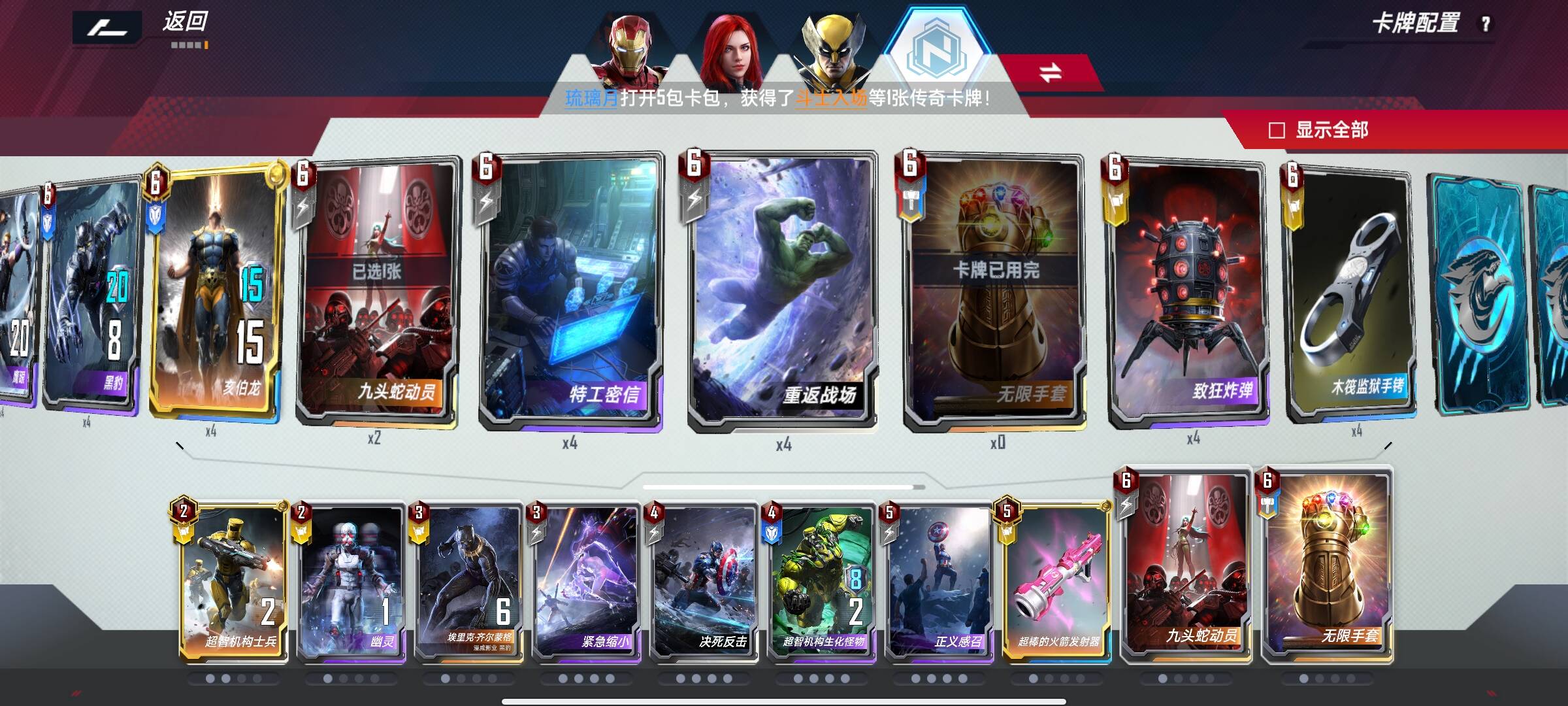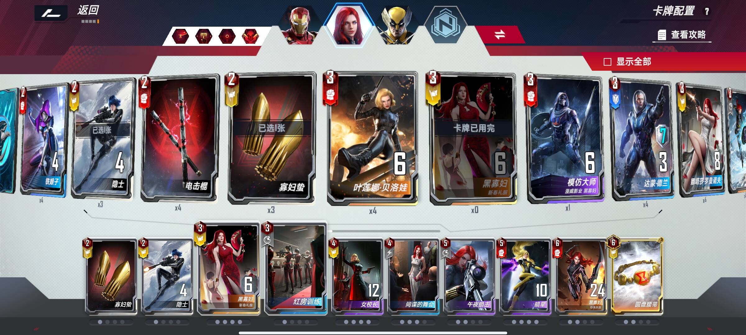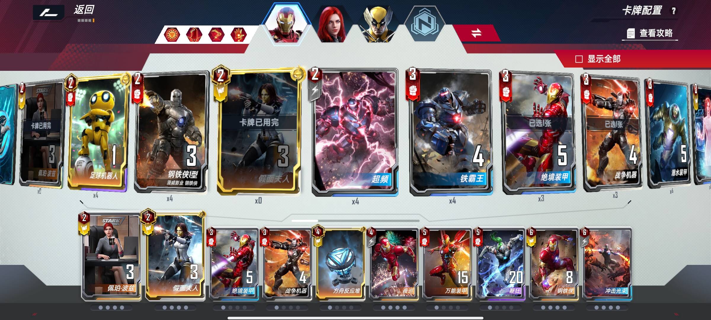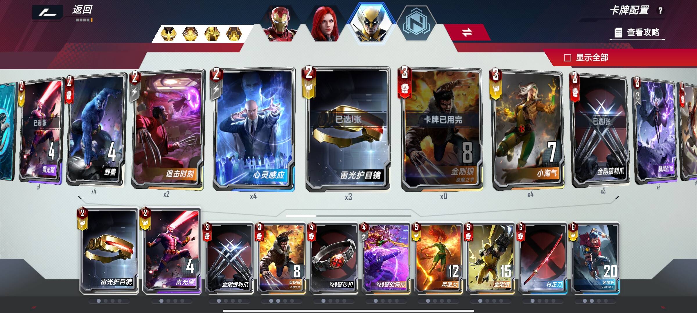 3回合有金刚狼卖掉辣椒假面金钱豹春寡守护怪除外的非关键牌,3狼配合守护怪单刷快速觉醒。有钱刷牌买非锁定牌