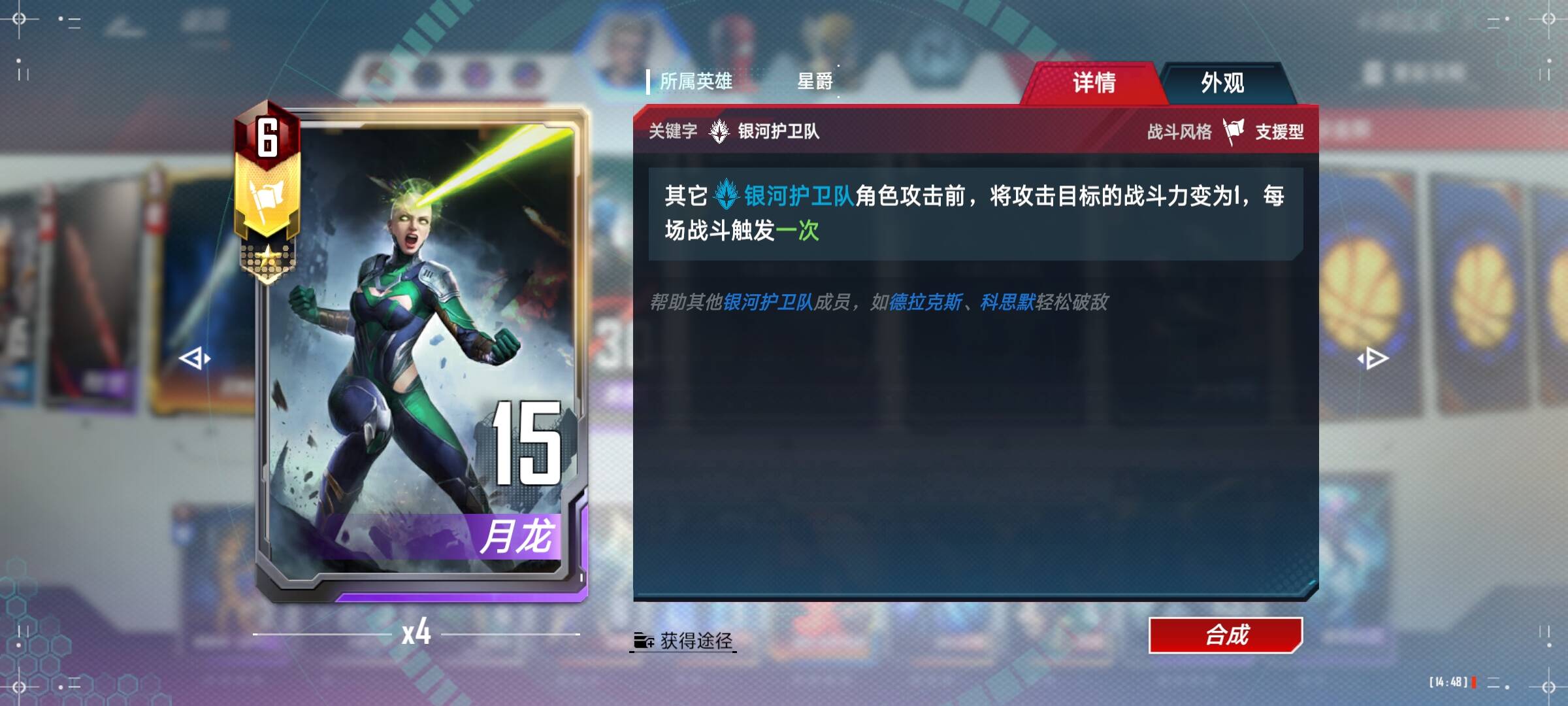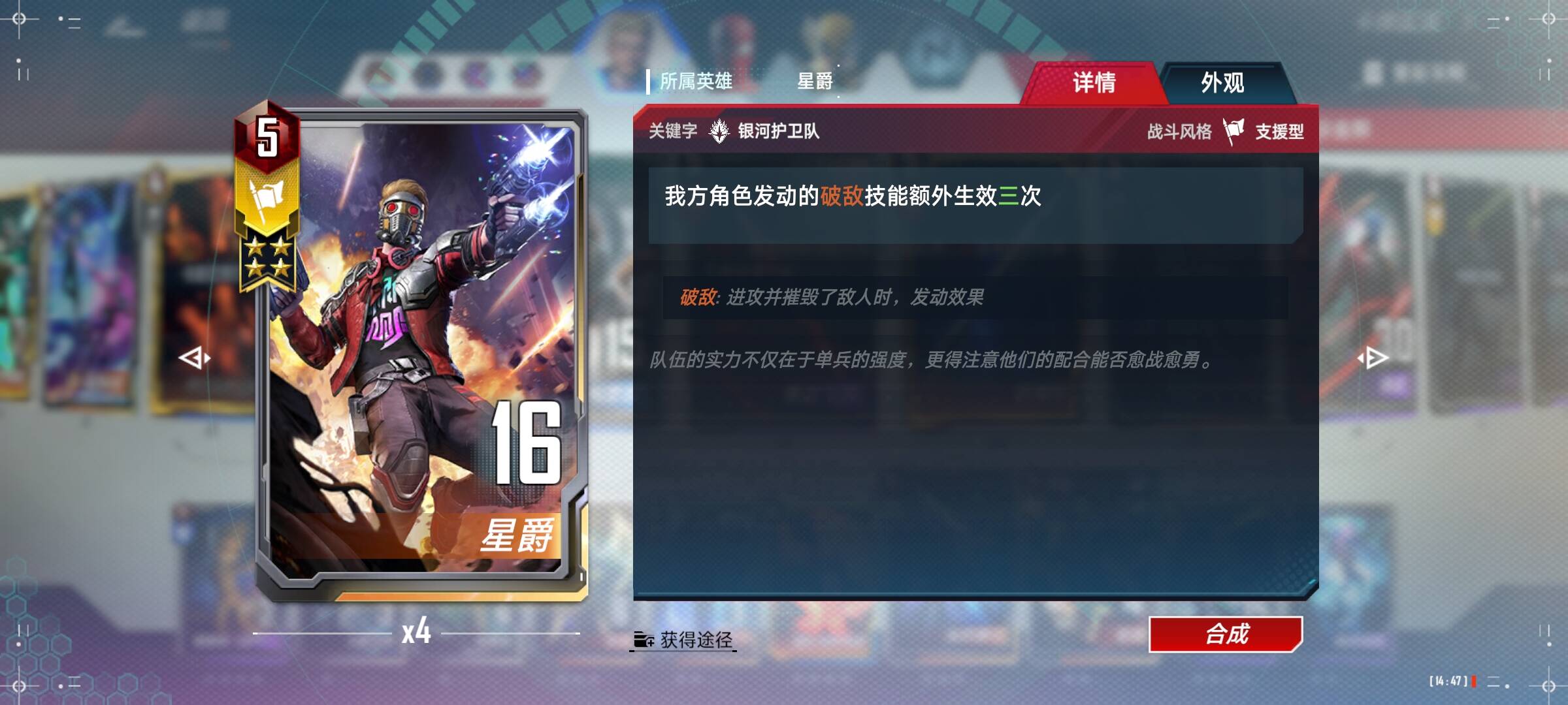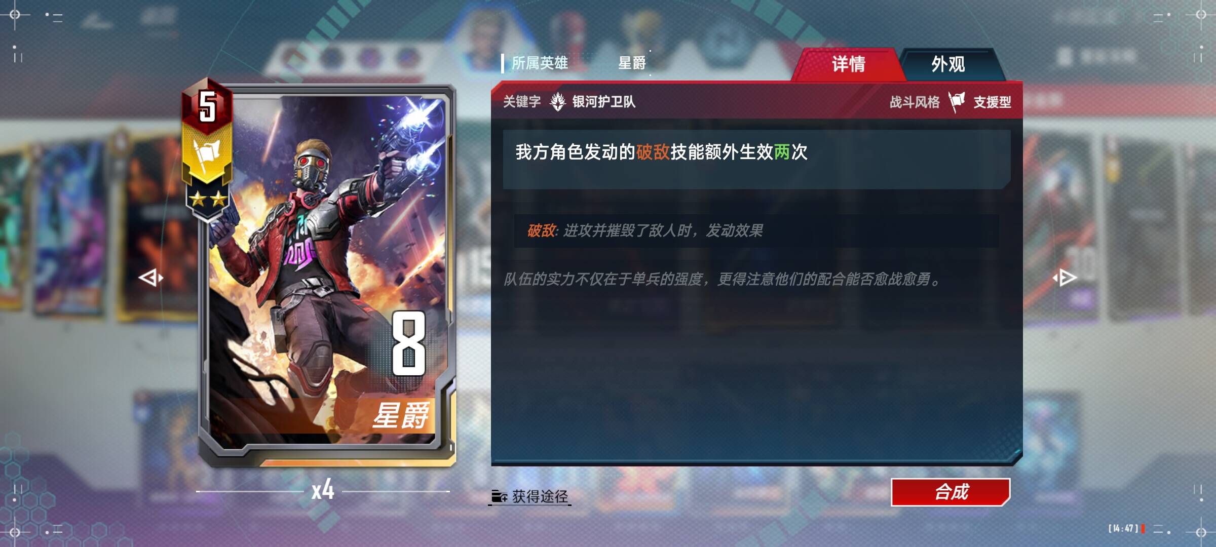 星爵:两张就够了,可以看到2星和4星星爵只差了一次生效,但是却贵了10宝石,我个人是觉得不太值得,可以随个人喜好满4。