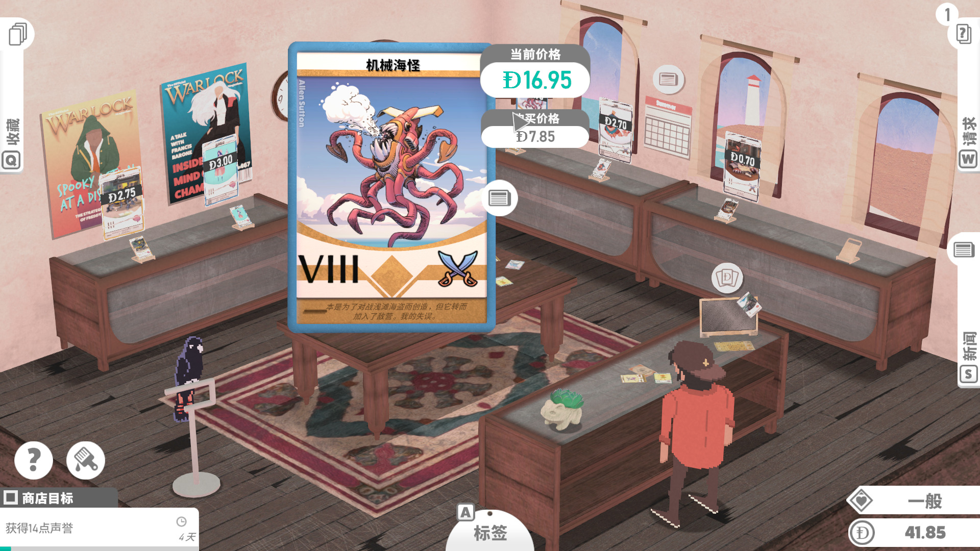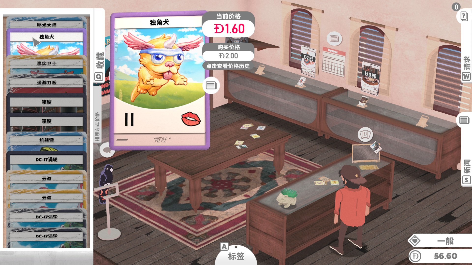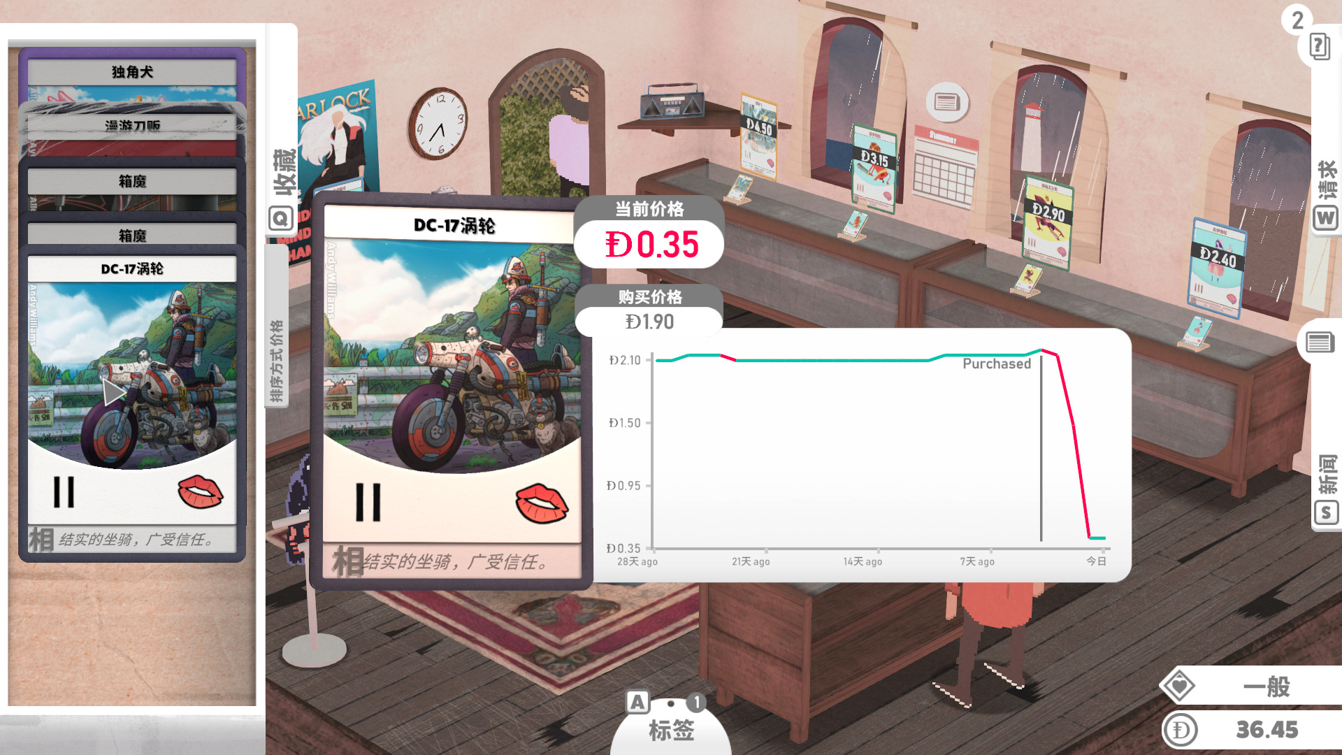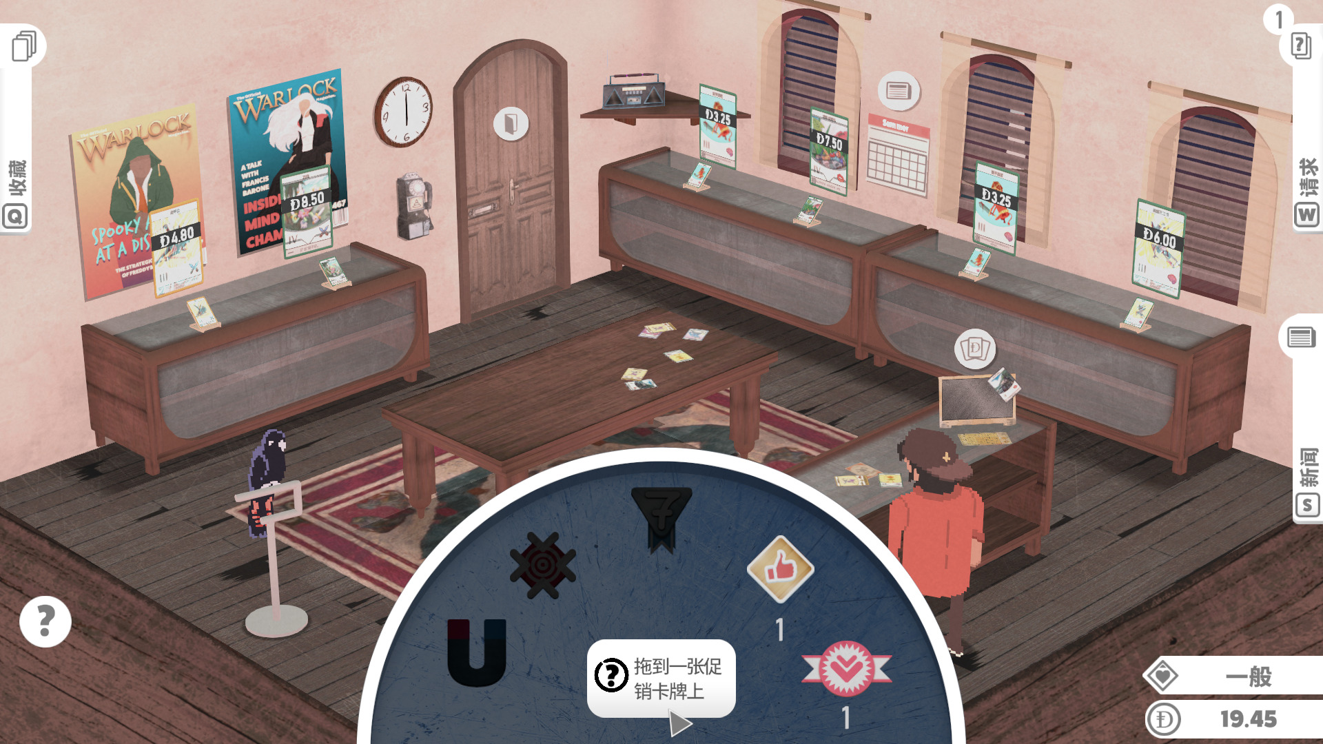 游戏的生意按天划分,当一天快结束,玩家们也都离开了商店,这时我们就可以收拾摆上架的物品,计算今天的收入,了解卡片涨价趋势,有时一些普通的卡会因为一些特殊的原因。