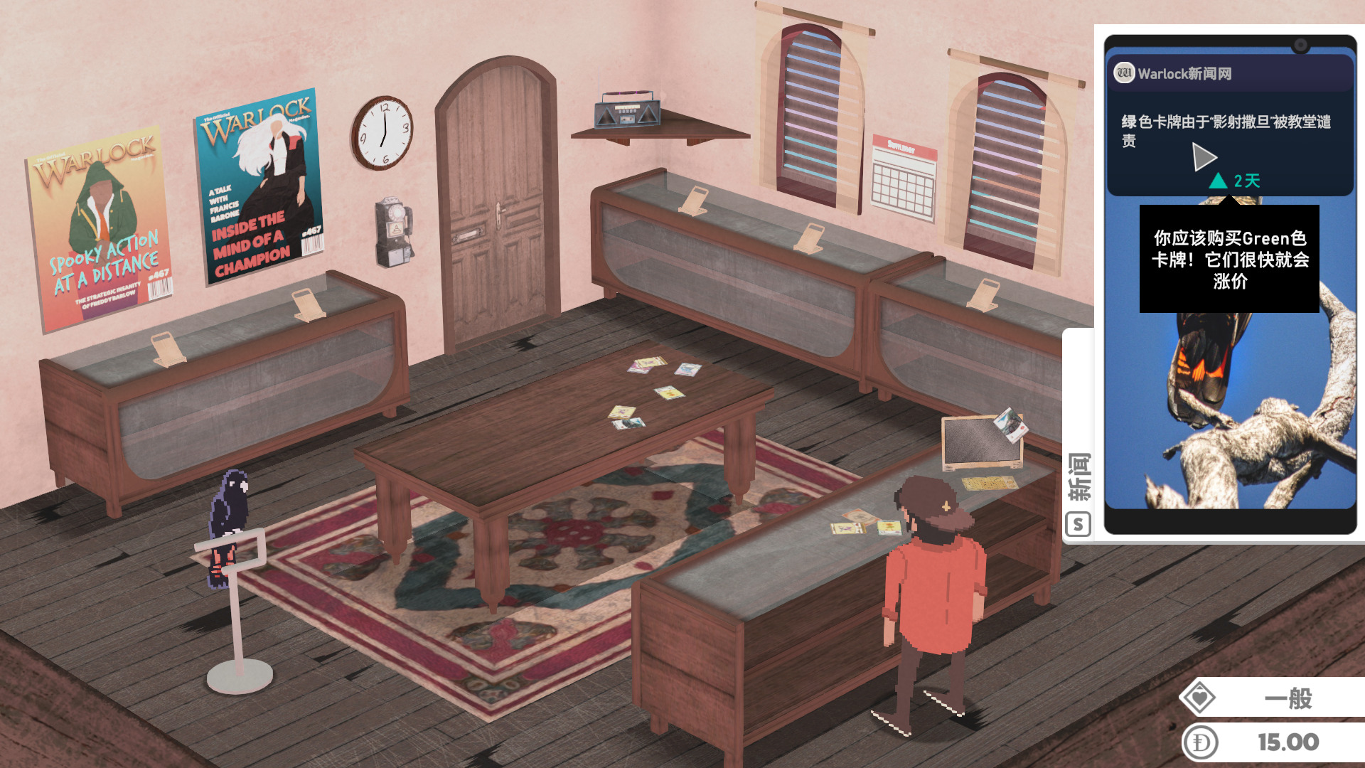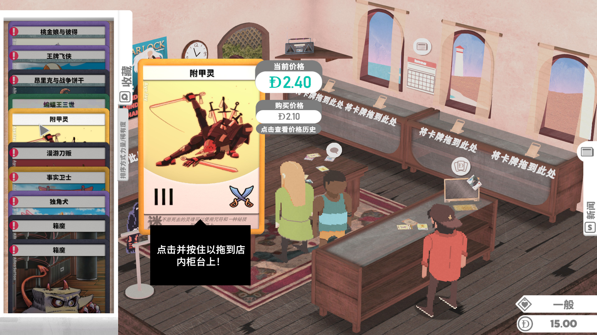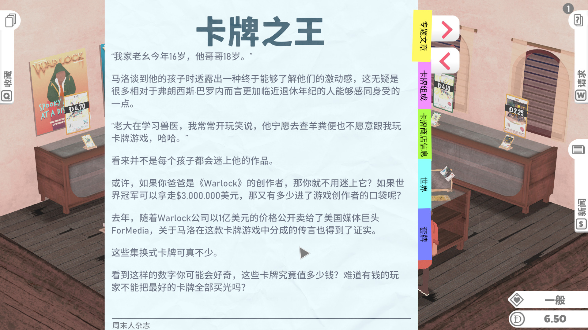 游戏的生意按天划分,当一天快结束,玩家们也都离开了商店,这时我们就可以收拾摆上架的物品,计算今天的收入,了解卡片涨价趋势,有时一些普通的卡会因为一些特殊的原因。