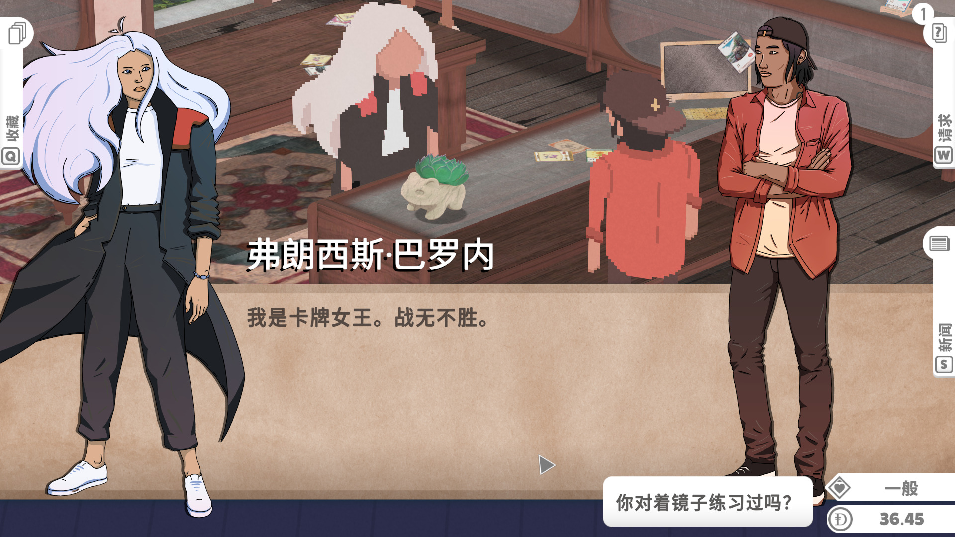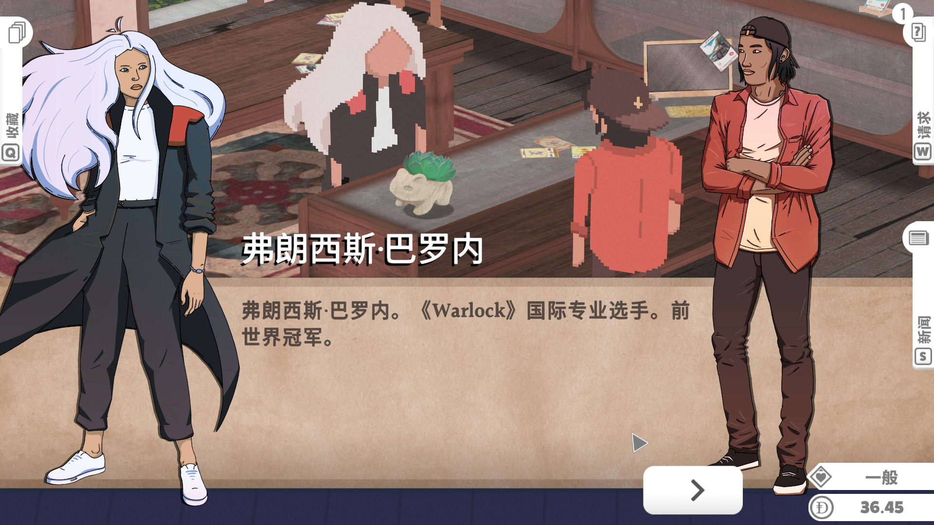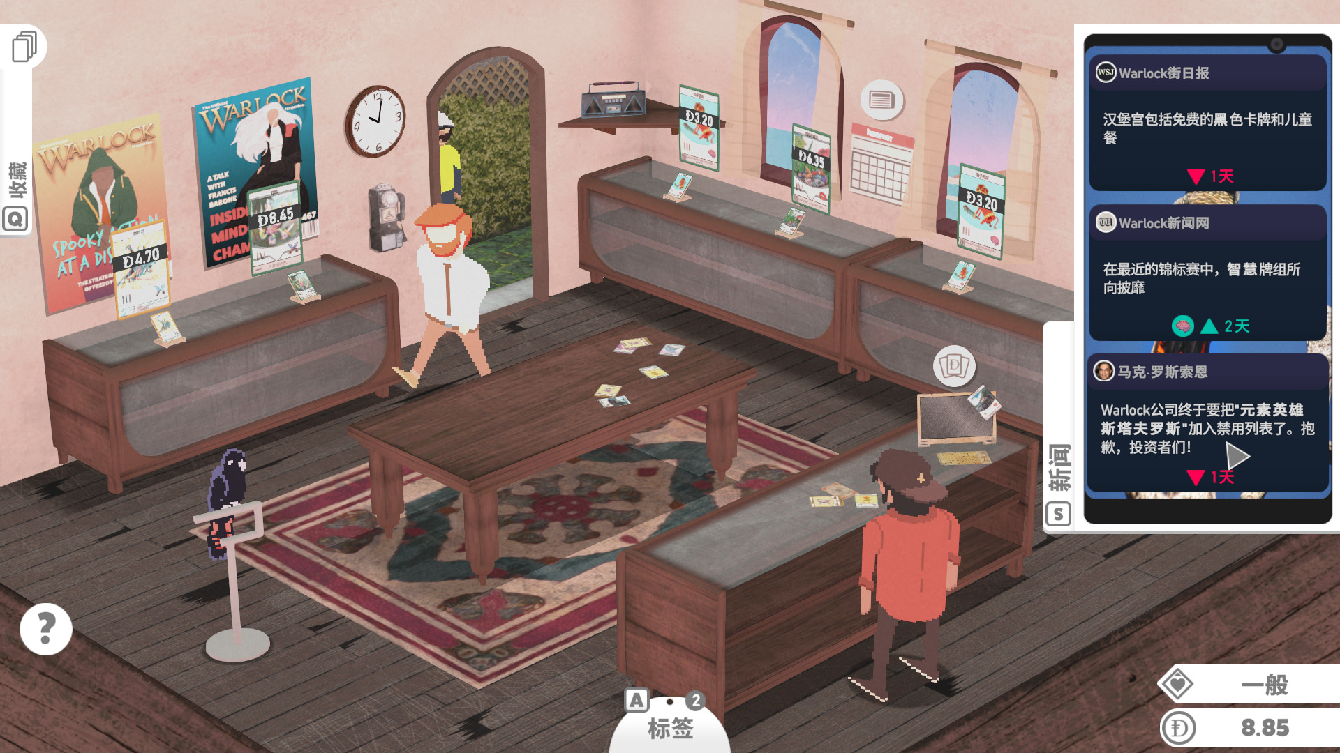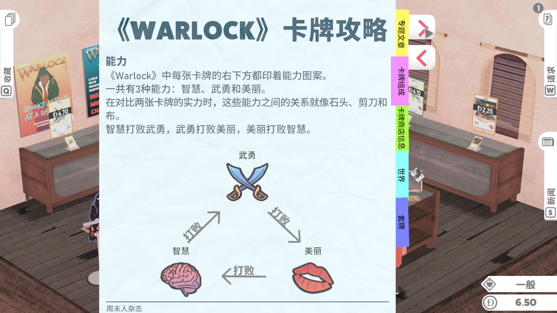 游戏的生意按天划分,当一天快结束,玩家们也都离开了商店,这时我们就可以收拾摆上架的物品,计算今天的收入,了解卡片涨价趋势,有时一些普通的卡会因为一些特殊的原因。