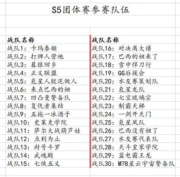 本次赛事采取战队vs战队的模式进行比赛,第一轮和第二轮比赛结束后,积分前十二的战队进入半决赛。以下是本次比赛的参赛队伍: