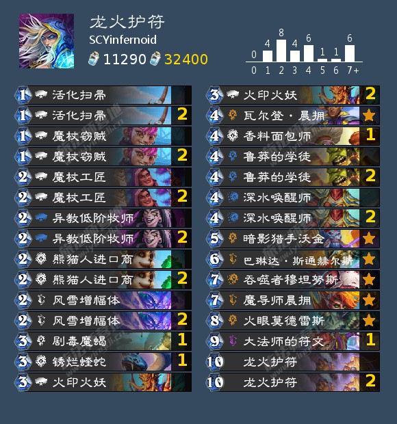 最理想的配合是用起手留下的巴琳达·斯通赫尔斯,抽上两张大法术,下回合丢出5费的龙火护符,这是一波比较大的场面压制,对手没办法处理时可以直接致胜。深水唤醒师定向抽取法术,叠甲的特效契合高费法术。最重要的一点是龙火护符的可交易属性,不会存在射手就卡手的情况,在需要巴琳达·斯通赫尔斯和深水唤醒师触发的时候,可以交易下去保证触发。深水唤醒师在多数情况下基本可以看作“5费34,战吼叠10甲,抽一张任意牌”,在面对快攻时提供了一定的生存能力。