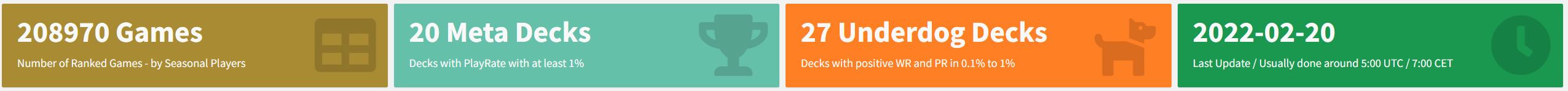 参与了「魔法厄运」季赛的玩家在过去3天**进行了 208970场 游戏,从这些对局**统计出20套版本套牌(使用率大于1%)以及27套下水道套牌(胜率过半但使用率处于0.1~1%)。