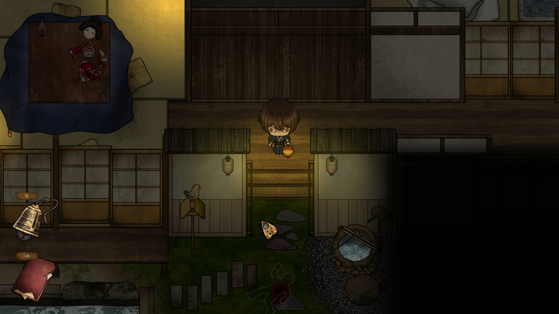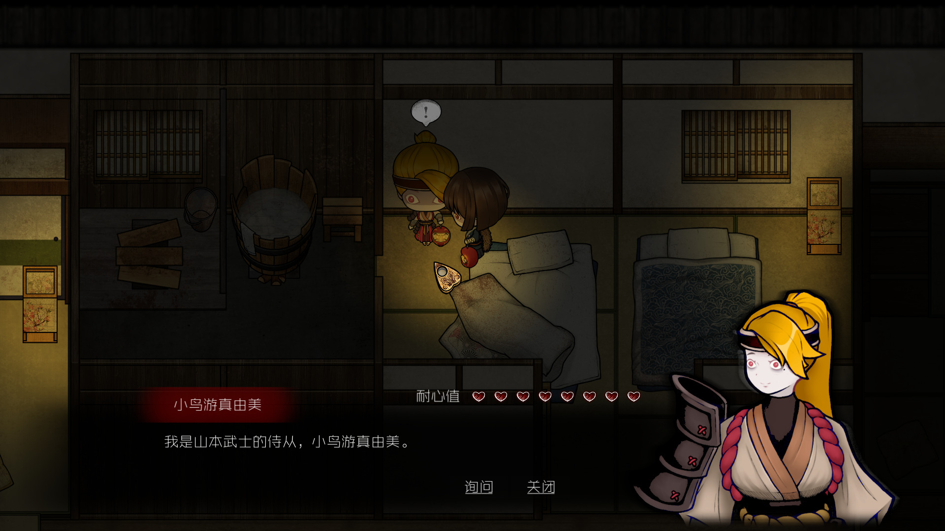 此时才算是游戏真正的第一关,画风一转,我们来到日本的一家洋馆,在看了洋洋洒洒的一段故事简介之后,大概是这么一件事:这个洋馆是一个武士,但这个武士死在了这里,现场只有一个形迹可疑的女忍者和另外一个女武士,我们需要找到真相才能离开这里。