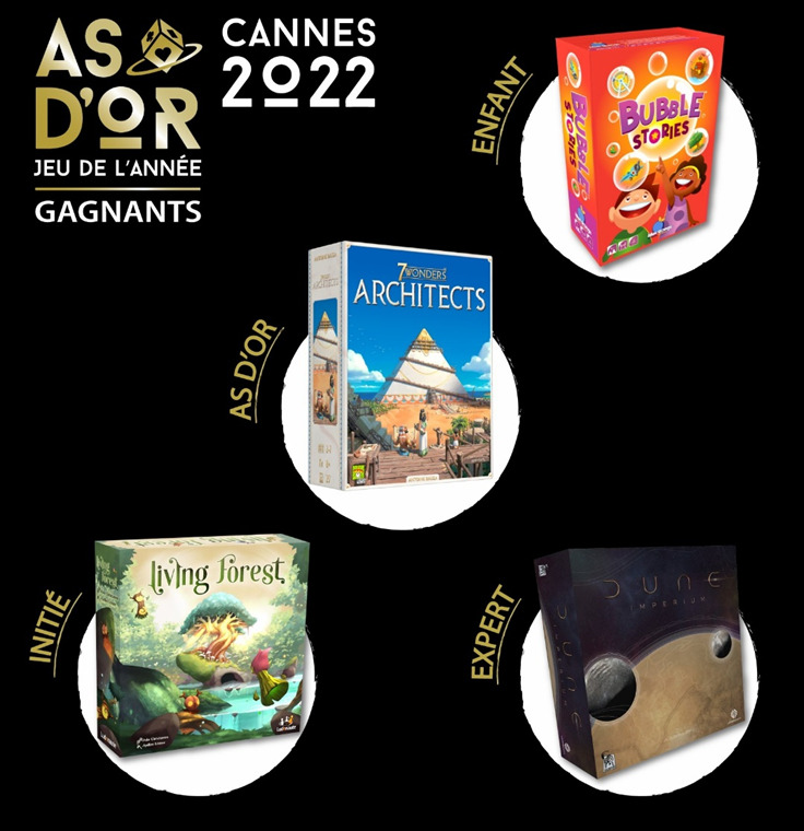法国的戛纳游戏节已正式开幕,将持续到本周末。另外,戛纳游戏节官方也正式揭晓了2022法国年度桌游奖(Ace d'Or 2022),各类别如下: