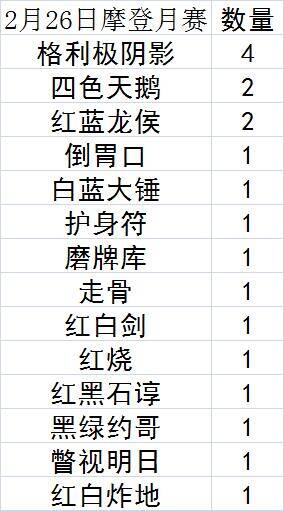 本次月赛共有19人参加,其中最多的套牌为格利极阴影,而在群里吹了一周的巨锤却只有我孤零零的一套(笑)下图为meta表
