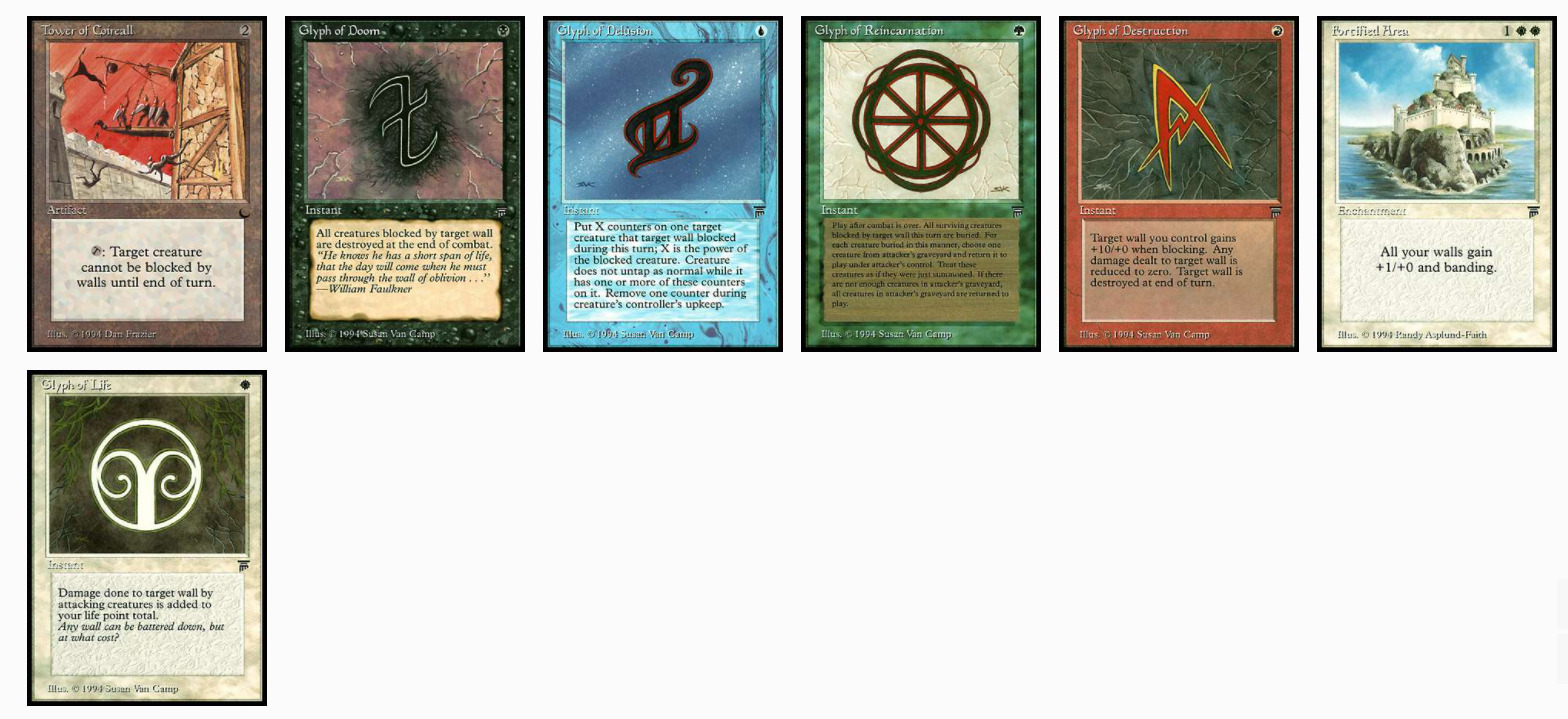 为什么烂? 曾几何时,当万智牌被创造出来的时候,曾经有一个生物类别——墙。墙牌都不能进攻。后来,威世智将这个关键词改为了守军,从此那个只有墙不能攻击的世界也一起改变了。再后来的卡都不再关注墙这个类别。这意味着那些曾经围绕墙类别设计的单卡变得越来越没有意义。