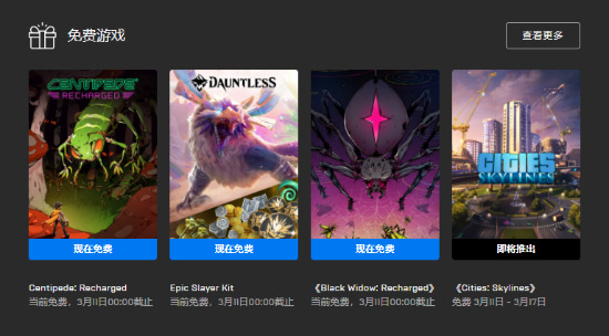 Epic商城的“喜加一”开启,本周送出《大蜈蚣》、《Epic Slayer Kit》、《黑寡妇:再充能》三款游戏,下周将送出《城市:天际线》。