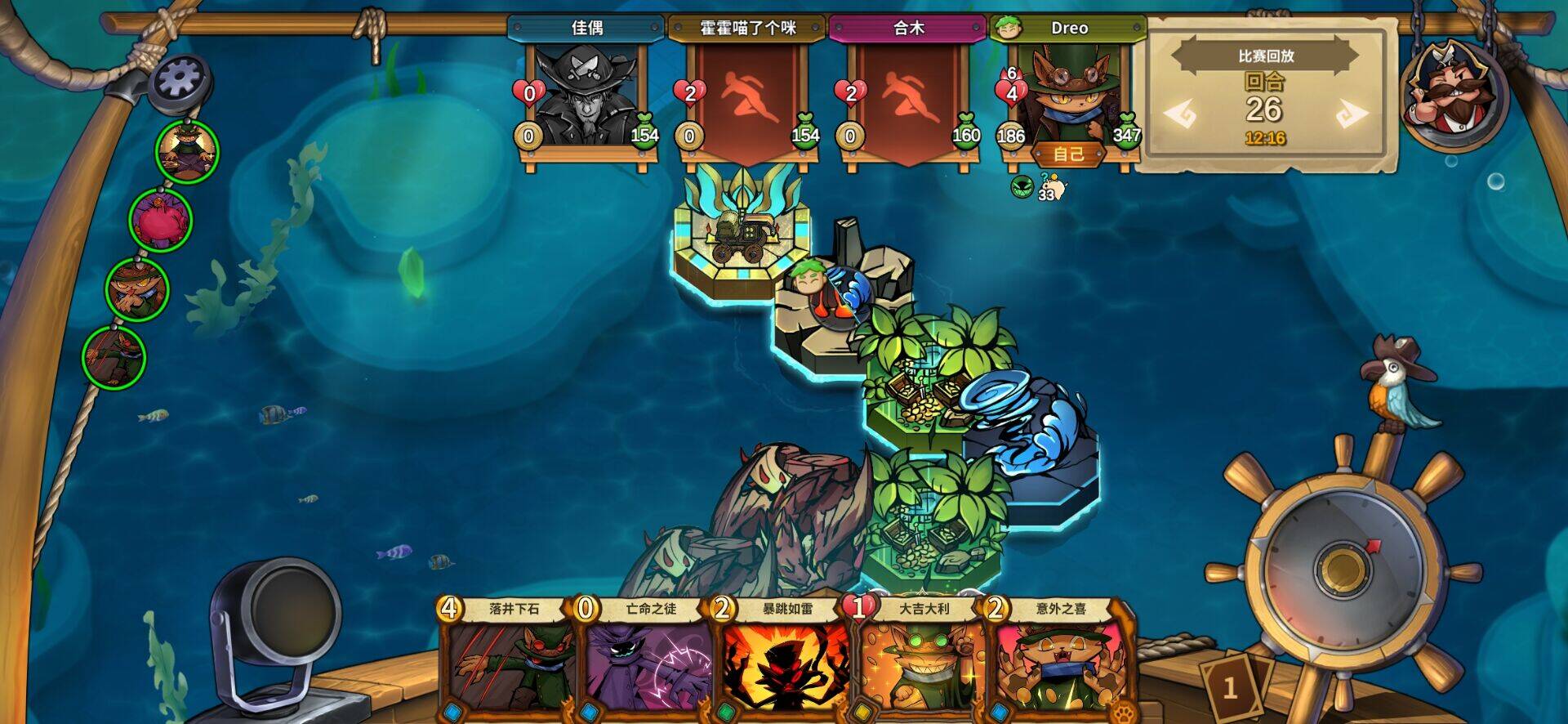 游戏中也拥有许多随机性,它们通过地形以及随机事件的形式展现——它们有的可以帮助玩家一夜暴富,有的则是会将其推向深渊,是赌一手还是退一步,皆在玩家的运营决策之中。比如绿色岛屿是安全岛屿,黑色岛屿则是必吃伤害,红色岛屿的伤害可以通过卡牌进行防御,有的时候玩家并不知道在前方的,到底是安全还是危险,是机遇还是灾难。
