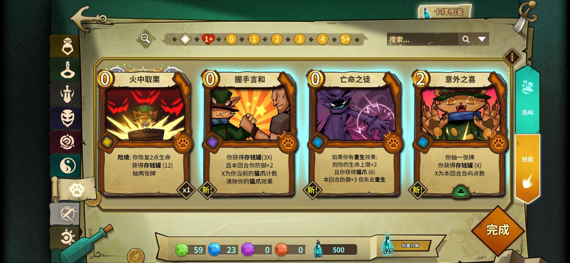 卡组构成分为“岛屿”以及“技能”两个模块,通俗来讲前者是与其他三位玩家一起提供并与系统设定的事件一起组合而成的“随机事件”卡池;后者则是通过收集获得的,当前游玩角色的特色能力;卡牌可以通过任务,购买,成长以及相关关卡奖励获得,需要一定的肝度,但同时因为游戏机制,不同稀有度的卡牌更多时候提供的帮助远不如运营带来的收益大。