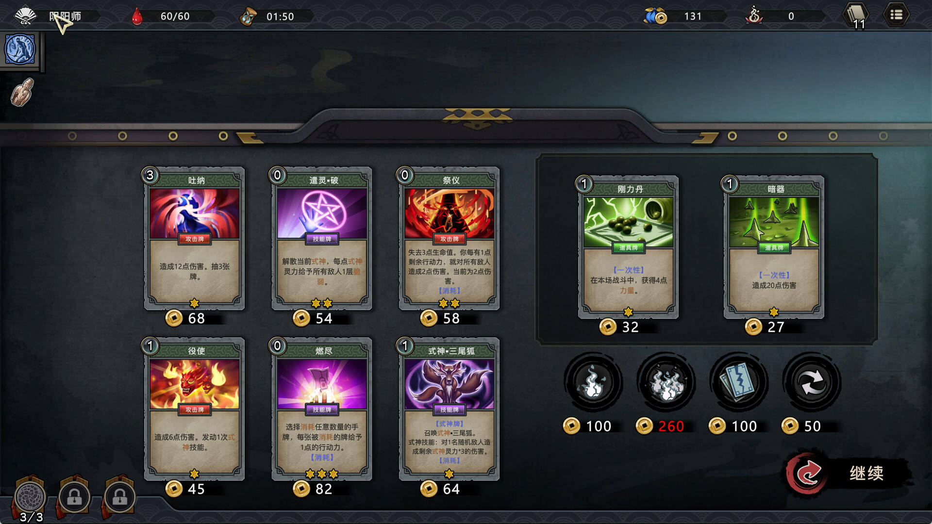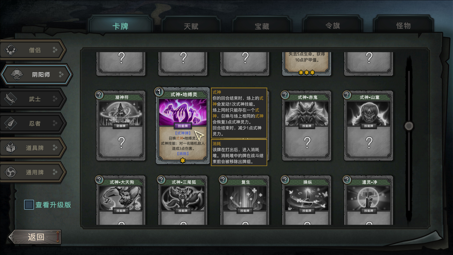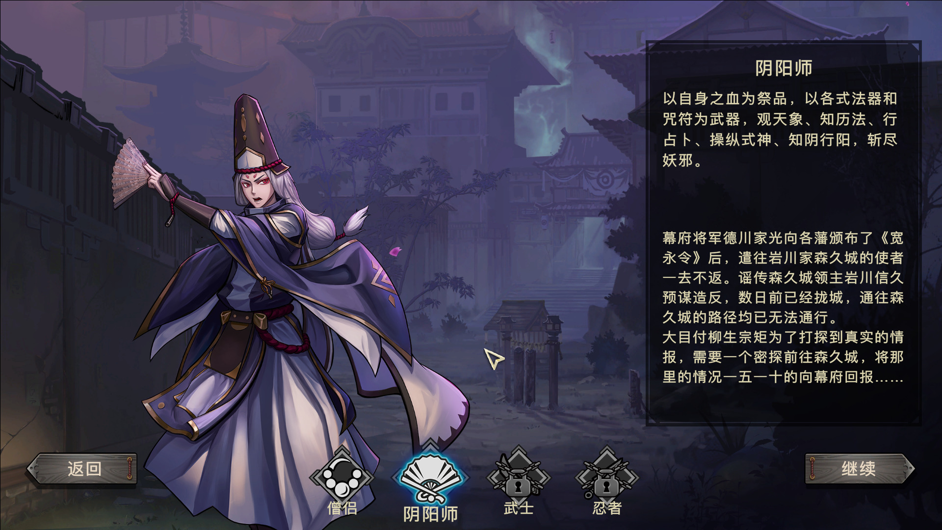 初始解锁的职业有僧侣和阴阳师这两个,后续通过游戏过关可以解锁更多职业。每个职业的能力和卡牌都不同,但是在选择界面我们完全看不到除了立绘以外的任何信息,真是奇怪。