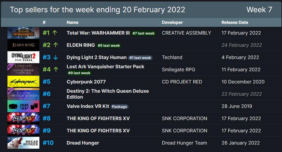 Steam公开新一周销量榜(2月14日至2月20日),《全面战争:战锤3》登顶结束了《消逝的光芒2》霸榜。随着《艾尔登法环》发售日来临,该作排第二。得益于1.5版更新,《赛博朋克2077》排到第五。