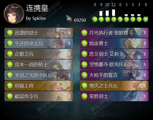 我最近花了21000以太的巨款合成了这套连携皇,也算是有了一些新发现,虽然感觉强度对不起花掉的尘,不过有新体验总归是好的。作为一套快攻卡组,连携皇确实非常典型:通过前期施压,迫使对手做出更差的选择,让游戏掌握在自己的节奏中,并最终快速地靠直伤终结对手。这种套路在远古的影之诗还算流行,大多数职业都有快攻思路,但是如今只有连携皇成立,一方面这是因为皇家确实拥有艾丽卡、绝灭之士兵长等最优质的快攻单卡,另一方面,也是因为在皇家的快攻体系中有非常优质的单卡plan B:荣胜剑士。