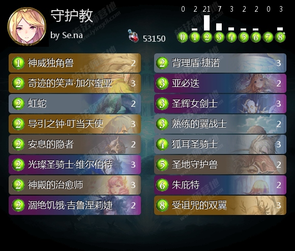 作为一套OOS版本才复活的卡组,守护教在DLC后的颓势几乎都有些可怜了。死骸突袭者对守护教来说极为致命,而死灵又一直是环境的中心,最近就连无进化轴的纯谢幕曲死都开始带上死骸突袭者了。不过,守护教对于其他卡组来说还是有一定优势的。在提速风潮之中,守护教是少有的既有前期能力又有后期能力的一套卡组,既可以靠前期坚挺的场面来防御一些偏快的对手,又可以拖到后期用圣辉女剑士防住偏慢的对手。