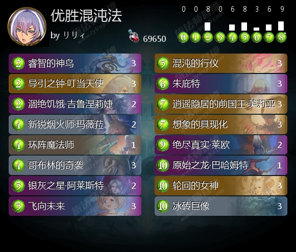 如果你仔细看看SVO West的数据就会发现,似乎在英文玩家心目中,混沌法是比进化法更适合赛场的构筑,而在日本的赛事中,进化法使用率经常是妖死之下的第三位,有时甚至能超越精灵。是什么原因导致了这种现象?结合SVO的赛制就不难猜到原因了。JCG和RAGE预选都是2套卡组打到头,因此,日本选手更倾向于根据卡组硬实力以及自己的熟练度来挑选更稳定的卡组,而SVO是3ban1,每名选手携带3套卡组,互相ban掉1套卡组之后再对战。因此,混沌法便由于更强的针对性而获得了很高的人气。而在天梯上,很多使用主流卡组的玩家也没有对抗混沌法的经验。除此之外, DLC的饿姐也让混沌法更容易在抢血卡组手下生存下来了。假如你觉得自己最近好像都没有碰到直伤龙或者连携皇了, 或许也可以考虑试试混沌法这套卡组。