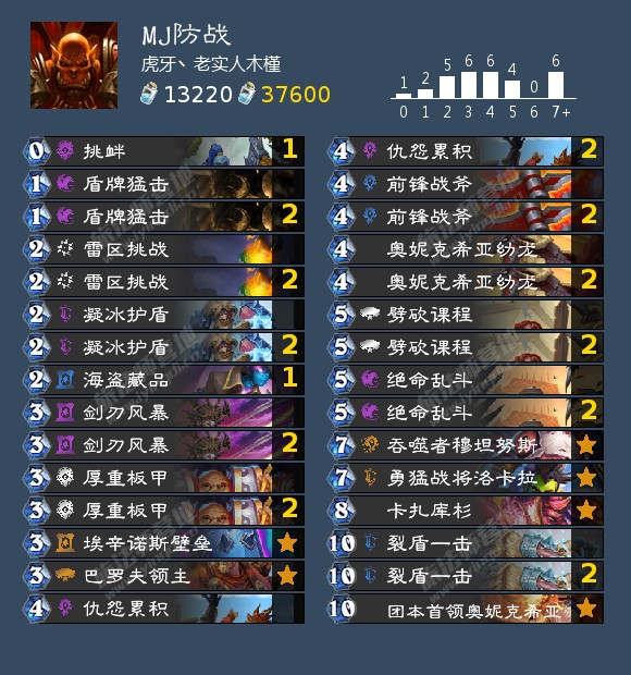 大家好,我是虎牙丶老实人木槿,是一个喜欢玩控制及OTK卡组的主播,今天给大家带来一套直播时打出9连胜的挖宝防战,先贴卡组。