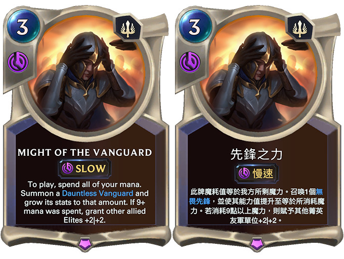 打出时需耗尽己方所有法力,总消耗记为X。召唤一个无畏先锋并增益到X|X。若X至少为9,给所有其他精锐友军+2|+2。
