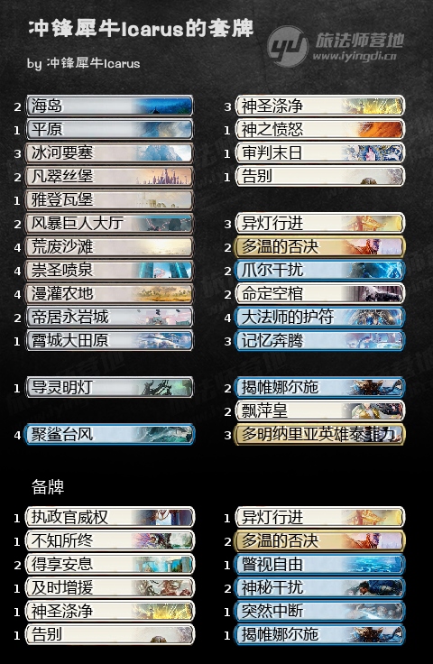 控制牌手当然也有机会从霓朝纪分一杯羹,白蓝控又加强了吗?我不知道,不过它有了新的组件可供选择,GALOPIN选择了当下各种意味上都非常热门的新鹏洛客——飘萍皇,确实,作为闪现而且能在回合外起动的旅法师,她的节奏非常适合留康的控制,造2/2警戒的异能也有机会作为结束比赛的手段。新的解牌——异灯行进和告别也一定程度上补强了以前史迹白蓝控只能算是一般般的去除池子,哦,千万不要忘记霄城大田原和帝居永岩城啊!