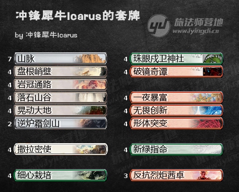 另一套同样来自ALTHERIAX的红绿无畏创新也非常值得学习,之前的创新组法都是洁斯凯色,这一套利用了不少neo派出衍生物的新卡,比如逆炉霜剑山、细心栽培和珠眼戍卫神社,其中细心栽培造的生物还是个罗堰妖精,能给计划提速。整套牌看起来干净又卫生干净又合理。另外终于有人想起来2费的新绿指命了,你还记得它四项都能干啥吗?