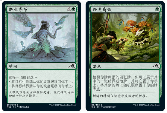 其实黑绿传纪的强大很容易理解,就是这两个色组的传纪实在是太赚了,梅泽俊郎生平纪、夜幕乱世抄上限是一换3的单卡!母圣树耸天际甚至还可以换更多!黑绿铁牌的传纪也很实用,还有新生季节这种牌能又捞生物又捞结界的,把这些结界再用一遍,还有野灵商谈这种又能找地又能找结界的润滑剂,别说金和密稀的传纪了,就银铁都没谁受得了。