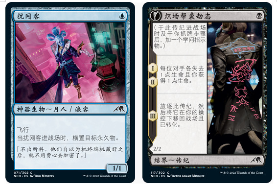 阿胡那可是相当喜欢忍者啊,又能打又忠诚,这么酷还会这么多招,招数还这么华丽,还有女忍者,又漂亮又听话身材又好体力又好...咳咳,说回来说回来,忍术这个异能真的是让人感叹设计者的心思奇妙,但是忍术成立的前提是未受阻挡,这个就需要我们有穿透生物作为忍术的载体,本系列蓝黑忍者最好的载体扰网客当仁不让,其次是炽场帮袭劫志,很特殊的是,扰网客在套牌中一定要有,但并不是多多益善,2张合适,3张到顶,再多的话套牌强度就开始下来了,毕竟你不能只抓小飞机,不抓忍者啊,而炽场帮袭劫志却可以多多益善,因为这玩意儿是真的可以打死人的。