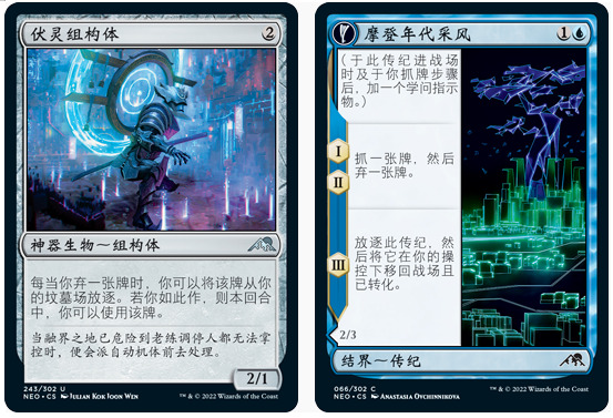 这个时候由于我几乎没抓到什么像样的去除,红色自然不考虑了,绿色并不开放抓到的最少,那就只能按着辉耀复兴的作用打白蓝抓尽可能多的神器结界,而接下来我又抓到了复数张的伏灵组构体和摩登年代采风,它们是有配合的赚牌引擎,不仅能帮我滤牌尽快找到辉耀复兴,还能主动把神器结界弃进坟场。