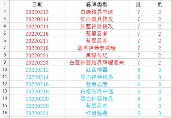 另外四个色组,红黑、红绿、黑白、蓝绿阿胡目前还没有打出7胜,牌表就没得了,大家可以在留言的时候跟阿胡分享一下这些牌组,让阿胡看看这些色组的7胜是怎么构筑的,这样阿胡也好朝着你们的胜利指引前进啊。