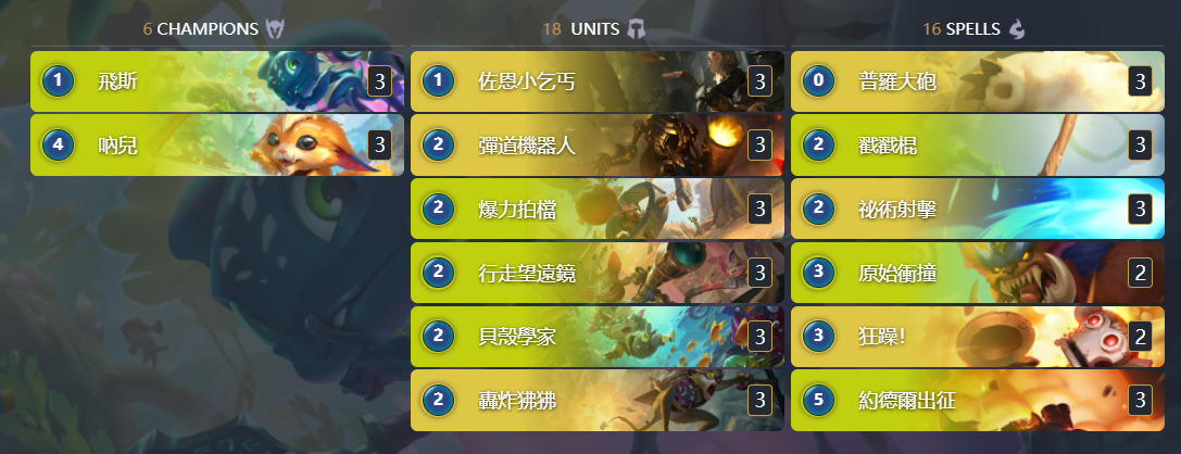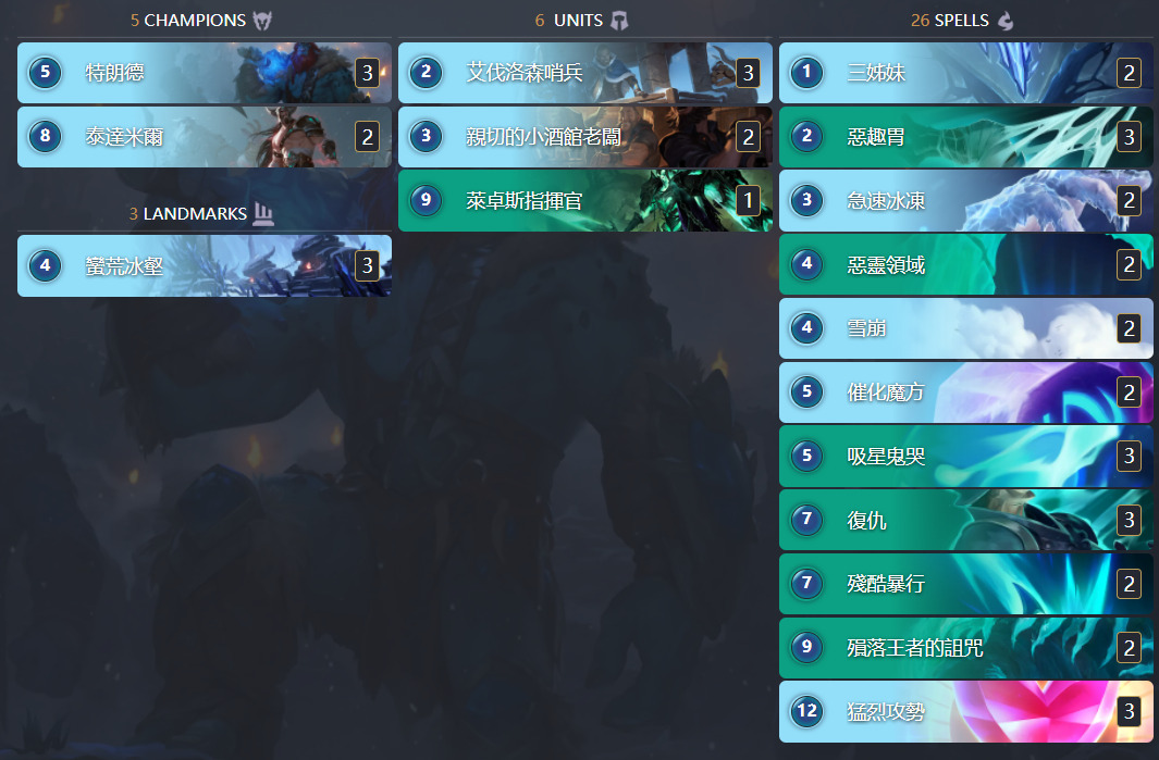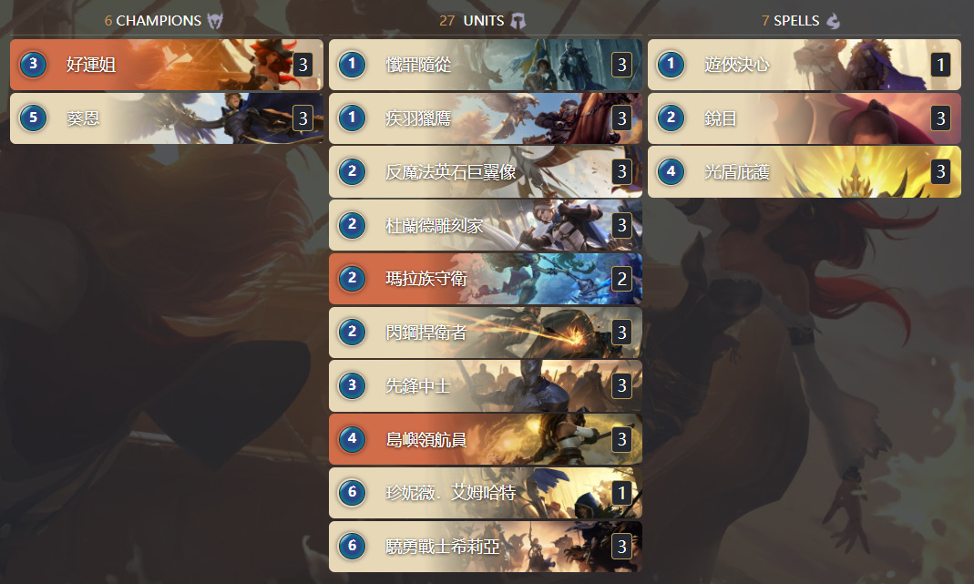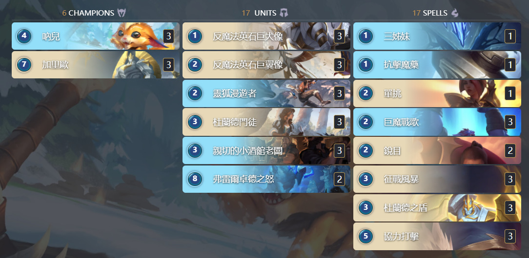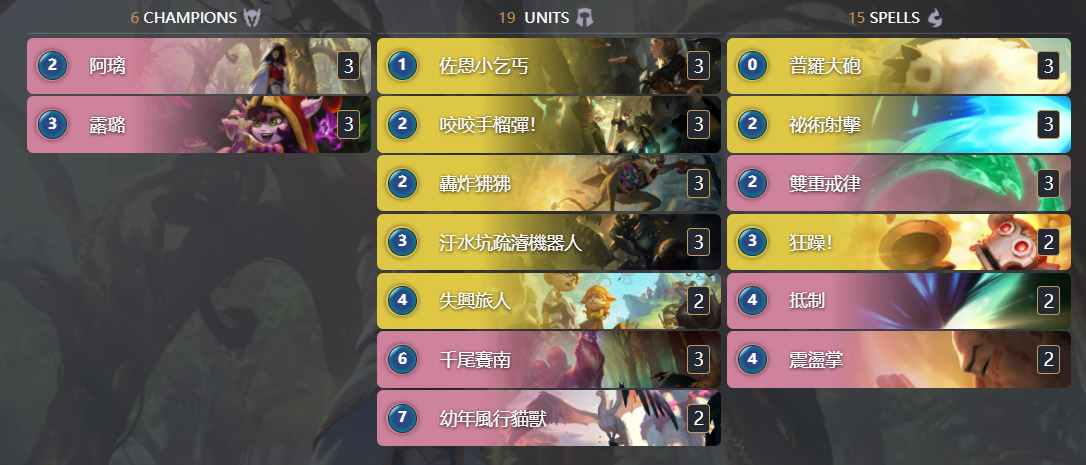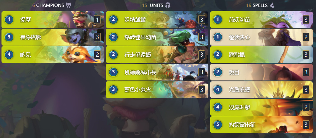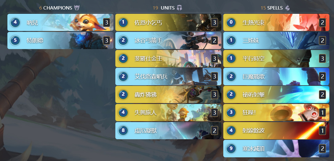 这套卡组将约德尔和妖精的协同作用结合在一个卡组中,以建立一个强大而可持续的场面。由于这套牌有许多廉价的多区域单位,小炮很快就能提升等级。一旦这套卡组在场面上占据优势,就会用约德尔出征和光盾庇护轻松结束战斗。