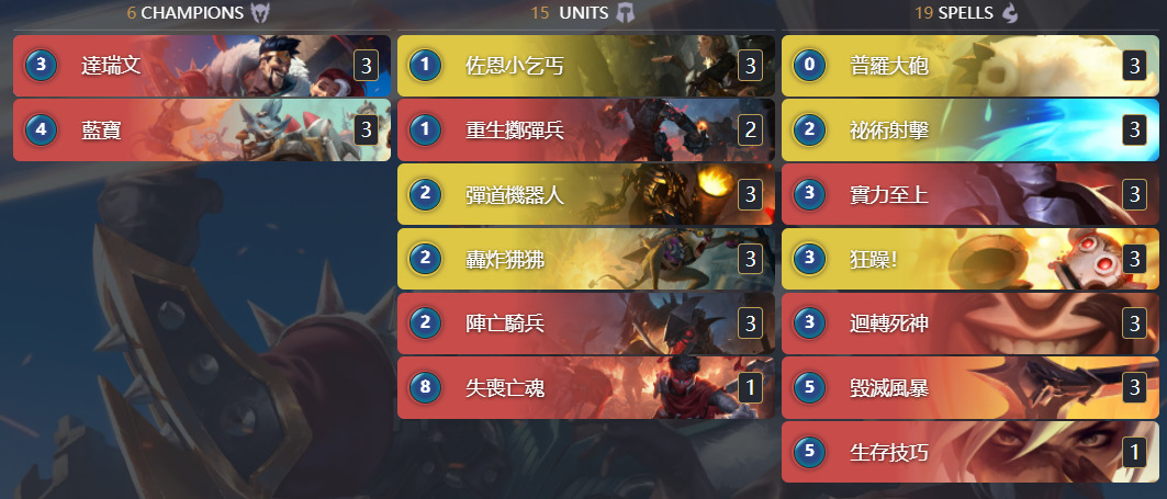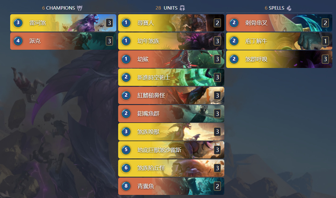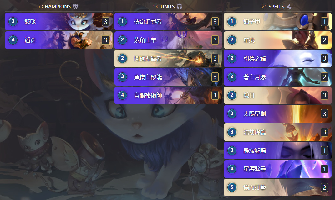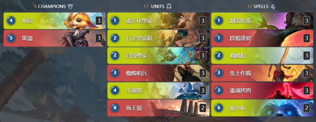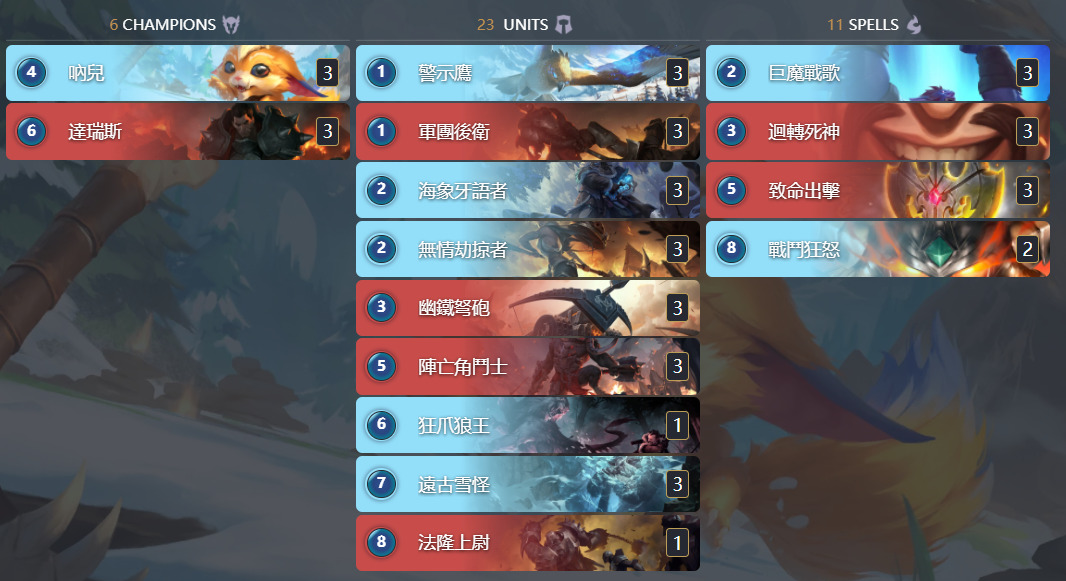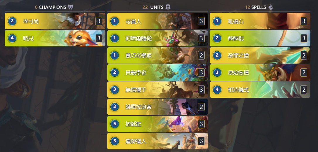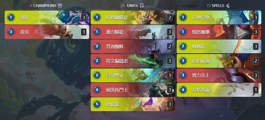 这套卡组将约德尔和妖精的协同作用结合在一个卡组中,以建立一个强大而可持续的场面。由于这套牌有许多廉价的多区域单位,小炮很快就能提升等级。一旦这套卡组在场面上占据优势,就会用约德尔出征和光盾庇护轻松结束战斗。
