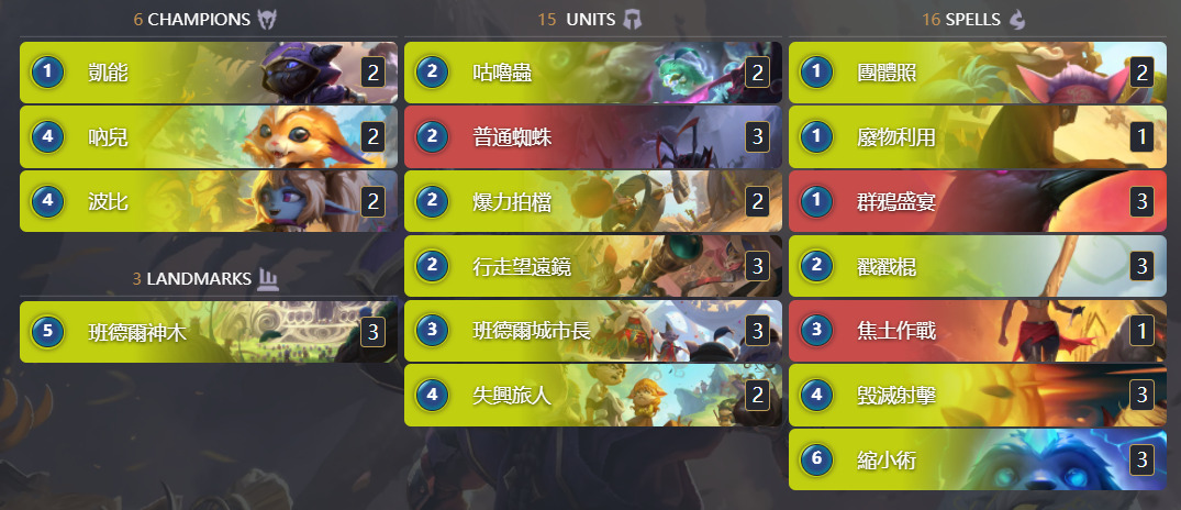 神木卡组如其名。由于有大量的多区域单位,它能很快地朝地标的任务前进,在大多数情况下都能以它结束游戏。由于小单位的快速铺场和成本效益高的清除,这套牌能够保护自己并创造出大量的场面存在——有时也足以造成很大的场面压力,用纳尔或波比结束游戏。
