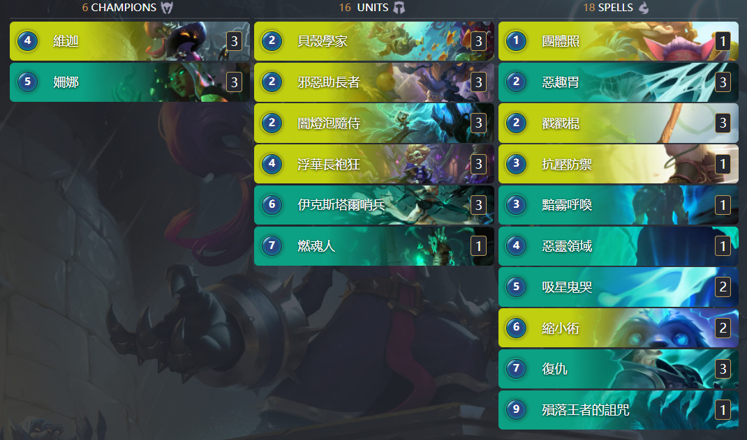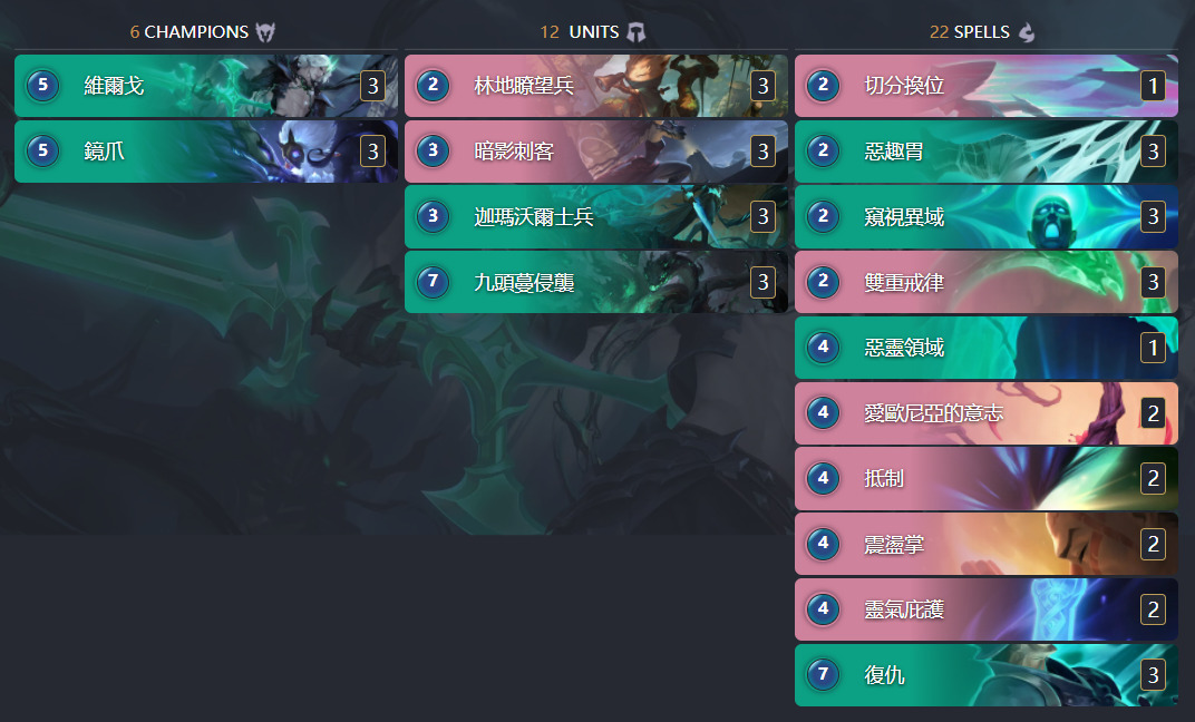 一套控制型卡组,旨在保持场面稳定,用其引擎滚雪球。暗影岛和艾欧尼亚的组合在拖延比赛方面非常强大。两位英雄和九头蛇都是非常强大的单位,如果不加以处理,会随着时间的推移建立起不可逾越的优势。艾欧尼亚带来了大量的保护法术,确保你的高投入单位不受对手的互动影响。
