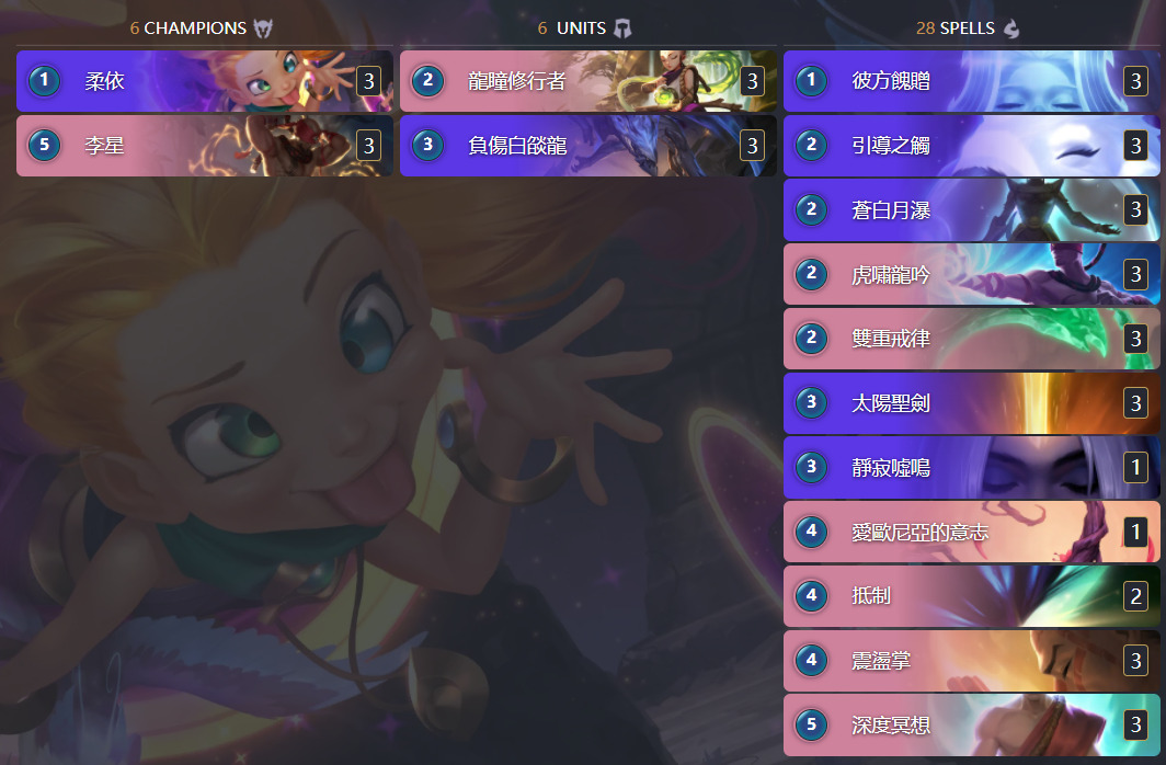 目标是把盲僧的等级提高,给他加BUFF和碾压然后用OTK把对手击败。盲僧自带光盾,这套牌也有很多额外的保护措施。佐伊在这套牌中是一个非常好的1费牌,她创造的法术可以帮助提升等级和保护盲僧。尽管是一套combo卡组,但由于龙瞳**者的存在,这套卡组可以在快攻时有很强的抵抗力。
