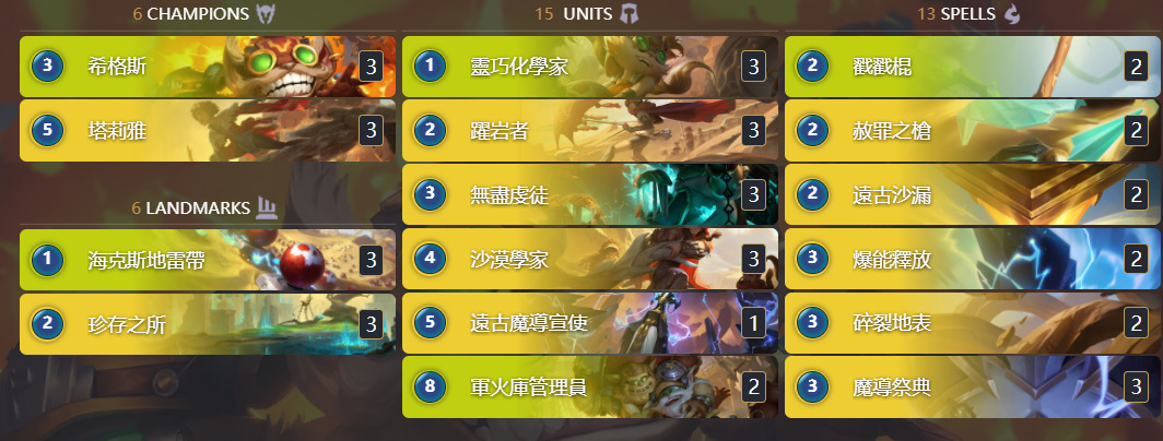 以地标性协同作用为中心的卡组。凭借其良好的早期曲线,它可以自我保护或向对手施压。赦罪之枪与岩雀是一个致命的组合,再加上古代沙漏,对付这套牌的关键单位可能会让对手感到困难。