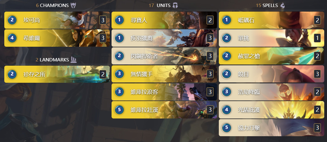 希维尔德玛西亚中速卡组,希望通过将光盾或快攻与打击效果和弱势关键词相结合,来创造场面优势。为了加强这种中速游戏计划,阿克尚用他的2级地标提供了一个强大的获胜条件。希维尔一旦升级就能迅速结束游戏,尤其与赦罪之枪和光盾庇护组成combo的时候。