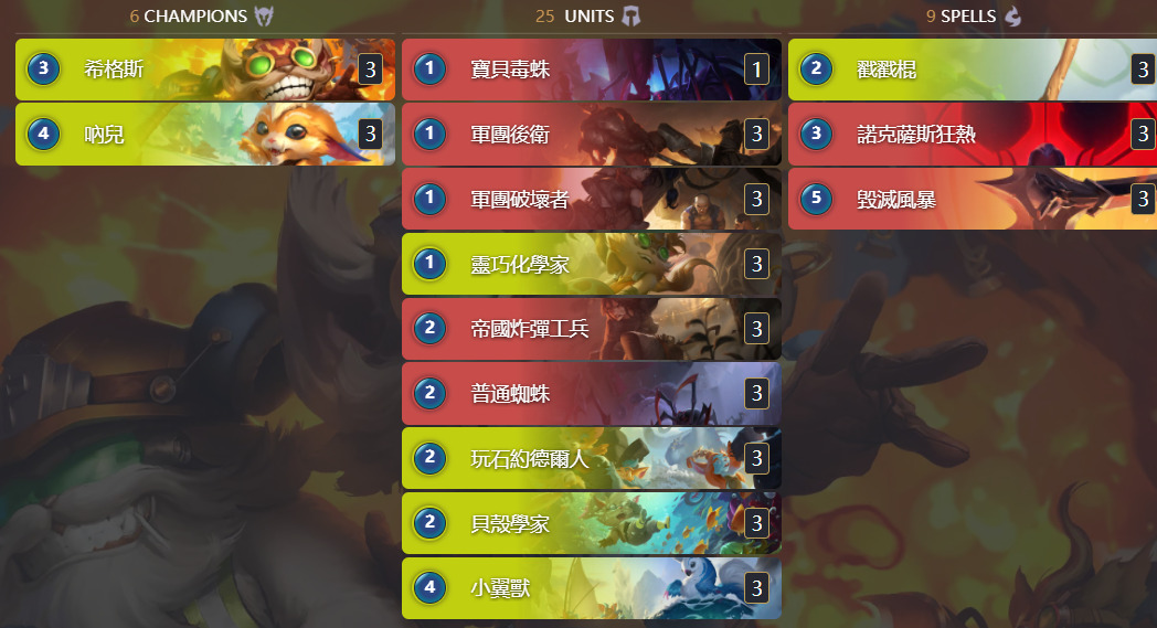 会让人联想到旧的约德尔烧。这是一个超快攻的卡组,希望用攻击性单位来推动前期伤害,并用打脸来结束游戏。这套牌中几乎每张牌都能直接造成主堡的伤害,因此非常容易将小翼兽和纳尔升级造成更大的压力。第二个英雄通常是齐格斯,但玩提莫的版本在天梯上也表现不错。