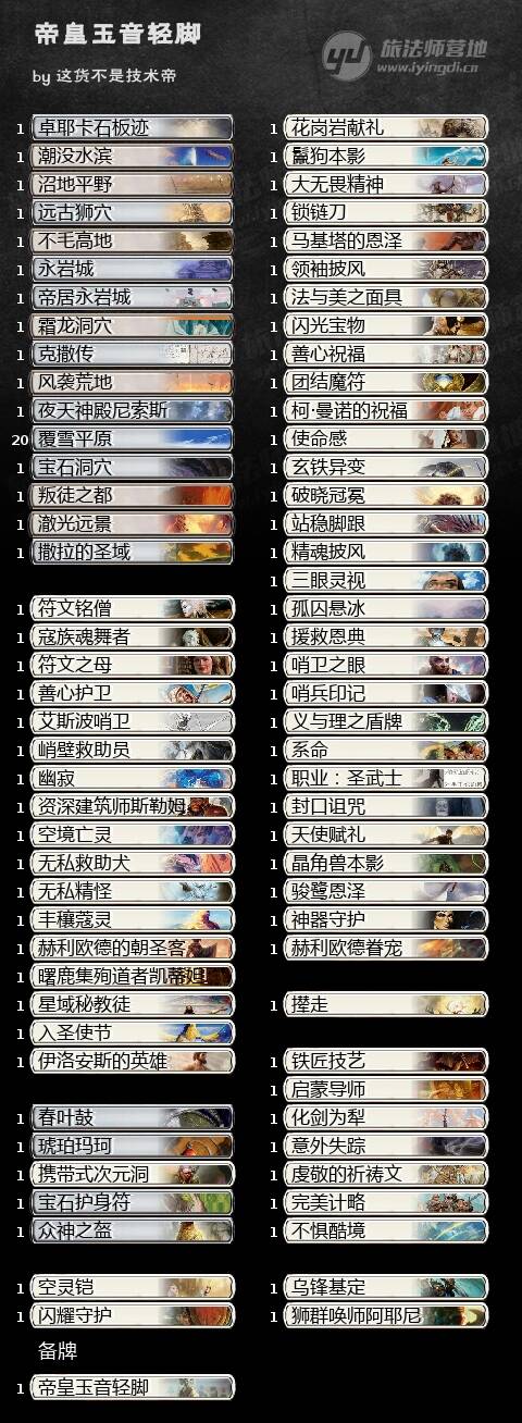 为了避免日内瓦退钱的情况出现,我还是给出一套个人比较满意的坐牢牌组在这(上图)。当然打法禁这种接近村规的赛事,快乐就完事啦。帝皇玉音轻脚在我经过了构思,模拟起手,打墙和殴打冠军这几个步骤之后,终于能站起来把这套牌分享给大家。按照惯例还是介绍基础的游戏计划,即一回合使用符文之母、符文铭僧、丰穰蔻灵、艾斯波哨卫等保护性单卡过渡,或者干脆打出春叶鼓、宝石护身符、琥珀玛珂尝试加速,在第二或第三回合直接于主回合内施放主将和1费灵气,找到一个定向的反色保护(如法与美之面具),熬过维持之后,便可以酌情选择主动变大(给主将贴上闪光宝物)、捏住闪现结界等着响应对面、寻找功能性灵气(闪耀守护、使命感)、赚牌赚血或过墙(天使赋礼、晶角兽本影),在20血法禁的环境下,一般主将只需要踢中两次就可以结束游戏了(1费的膨胀终点是空灵铠、2费的膨胀终点是闪光宝物,能被克撒传找到的神器膨胀终端是众神之盔)。