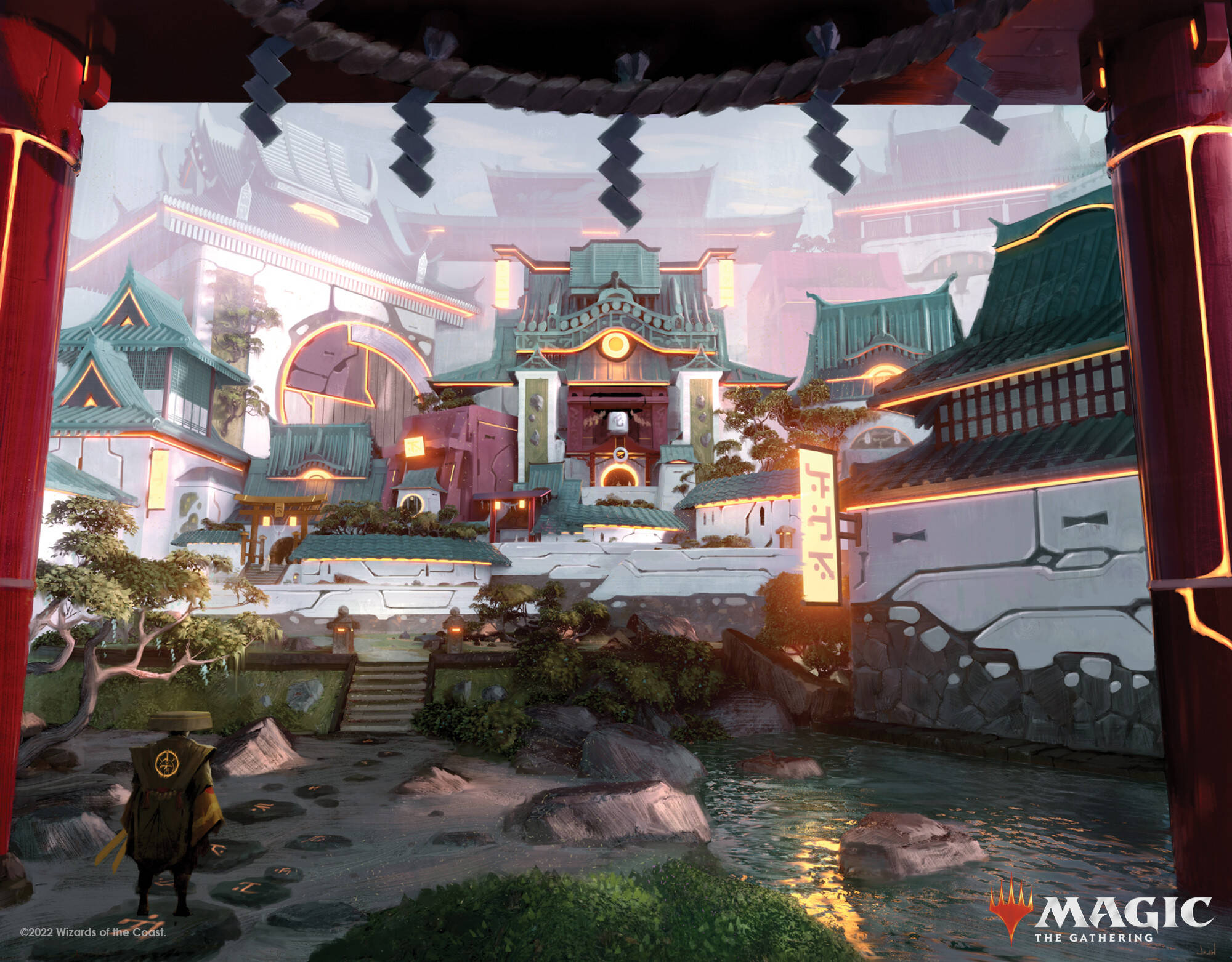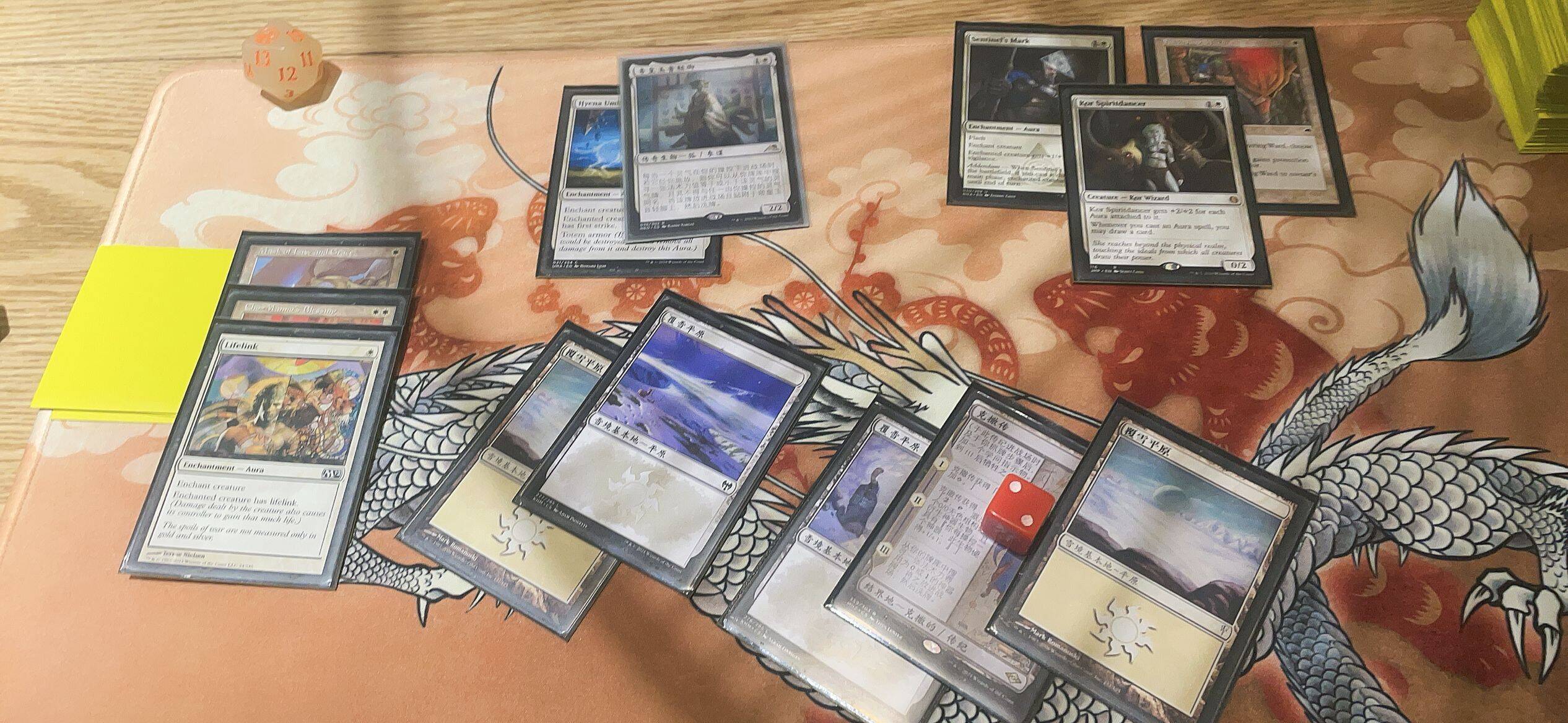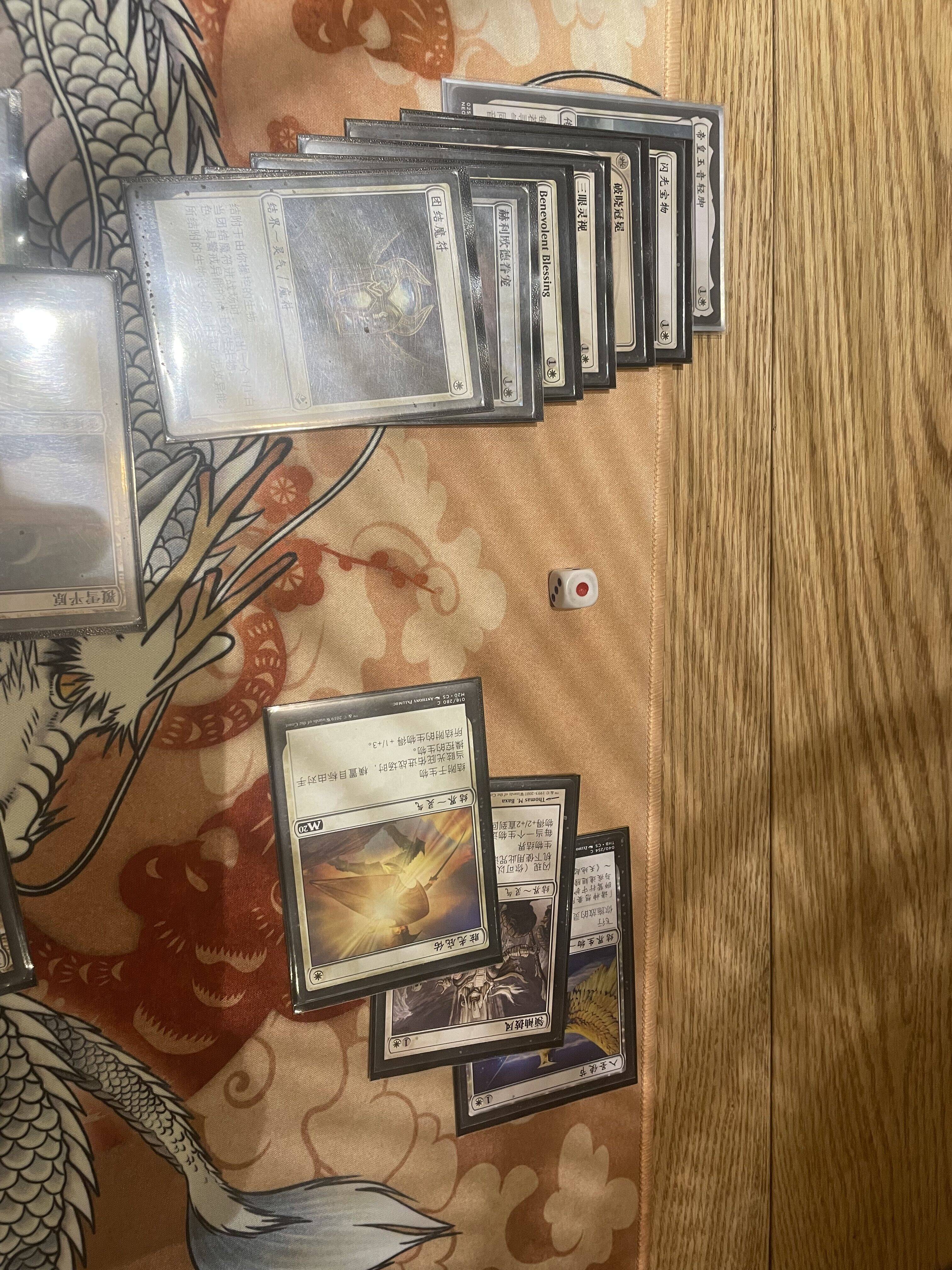 根据你的游戏计划,你需要增加以下单卡来完成你的套牌:1费打下去可以产生保护/跳费的单卡(这里注意铁匠技艺因为可以让永久物辟邪,所以当对面的游戏计划是先去除掉反色灵气,再接一个去除打掉主将时,你用1费就可以防住了。给不灭又能防扫场效果)、1费可以裸下产生锁效果的结界,2费所有能给灵气减费的生物(其中最优质的是入圣使节,自身是结界,又能飞行,可以贴一两个皮给他进行输出),2费能在施放灵气时抓牌的生物(寇族魂舞者,资深建筑师斯勒姆,环境不快时再增加一张台地咒术师),1费及以下的去除,1费及以下的保护。这里你会发现,除了替费的幽寂和虔敬的祈祷文,卡组里的顶费曲线是3费,如果你感觉对局被拉长,你可以考虑增加一些4费朝上的牌,除了4费灵气三维度,你还可以酌情带上宫殿狱卒和美善宫廷这样的单卡。在我模拟起手和实战中有时候会发现法术力用不完,所以这里需要注意,也需要更多比我强的牌手去实践出更好的构筑来。曙鹿集殉道者凯蒂妲 是一张优质回报单卡,肯定跟假卡驮炮河童不能比,不过它的惊扰效果也能触发主将异能找灵气。(模式双面牌在施放背面时,按照其正面的费用来计算法术力值713.4b)最后查缺补漏,是时候加点旅法师了,可以分别带上一张快速游戏时能赢的狮群唤师阿耶尼和一张打长盘更厉害的乌锋基定。如果你害怕阻挡者太少(基定直接打下去容易被踢死,它的异能也不能给主将提供太多帮助,纯粹单卡质量堆砌的牌),或者你喜欢风味,喜欢中速思路。你可能需要一张云游归来的飘萍皇。在结束阶段闪现飘萍皇造武士,转到自己的主回合再找到眩光庇佑 ,就可以实现生物硬去除,因为笔者暂时还没买到飘萍皇所以干脆两张牌都没有投入。二次元闪卡虽然好看,但价格也是非常劝退,开了3盒又打了3场现开却没开出什么大货的我选择暂时放弃收顶闪。