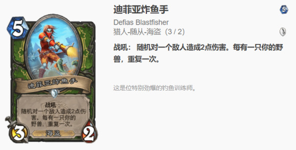 - 而在死亡矿井迷你包里,为了配合这个主题,出了大量的迪菲亚前缀的海盗卡,新大范也拥有了海盗词缀。这里特别提一下迪菲亚炸鱼手,他的卡牌说明是“这是位特别劲爆的钓鱼训练师”。