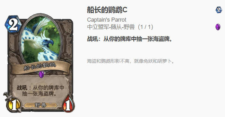 - 早在炉石刚推出时,就已设计了一张特殊的卡,船长的鹦鹉,需要通过集齐所有海盗卡来完成成就获取。他的卡牌说明是“海盗和鹦鹉形影不离,就像兔妖和胡萝卜”,为什么会有海盗和鹦鹉这样绑定的形象呢?